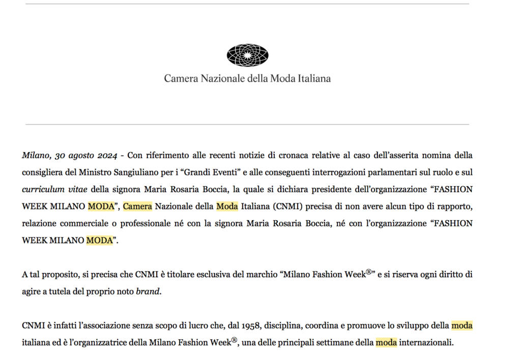 “Con riferimento alle recenti notizie di cronaca relative al caso dell’asserita nomina della consigliera del Ministro Sangiuliano per i “Grandi Eventi” e alle conseguenti interrogazioni parlamentari sul ruolo e sul curriculum vitae della signora Maria Rosaria Boccia, la quale si dichiara presidente dell’organizzazione “FASHION WEEK MILANO MODA”, Camera Nazionale della Moda Italiana (CNMI) precisa di non avere alcun tipo di rapporto, relazione commerciale o professionale né con la signora Maria Rosaria Boccia, né con l’organizzazione “FASHION WEEK MILANO MODA”. A tal proposito, si precisa che CNMI è titolare esclusiva del marchio “Milano Fashion Week®” e si riserva ogni diritto di agire a tutela del proprio noto brand. CNMI è infatti l’associazione senza scopo di lucro che, dal 1958, disciplina, coordina e promuove lo sviluppo della moda italiana ed è l’organizzatrice della Milano Fashion Week®, una delle principali settimane della moda internazionali.” Insomma questa signora aveva già aperto una bel profilo ig della sua associazione Fashion Week Milano Moda con la seguente definizione “associazione che disciplina, coordina e promuove lo sviluppo del Made in Italy ( con tanto di bandierina italiana), organizza, coordina e promuove eventi prestigiosi (punto esclamativo). Io sto ancora ridendo.