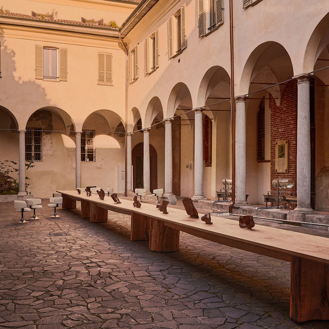 Il cortile è l’inaspettato scenario di una dimostrazione di arredamento su scala immensa. Con una lunghezza di quasi 16 metri e uno spazio per 50 posti a sedere, il tavolo in legno progettato dall’inglese Sebastian Cox è una presenza fisica dominante. Già collaboratore di Aesop per i suoi negozi di Marylebone e Rotterdam, Sebastian ha scelto il Cedro del Libano per i piani del tavolo. Questa scelta fa sì che il legno sprigioni un aroma magnifico, che ricorda quello del Cedro Atlas della collezione Eleos di Aesop. Con una serie di formulazioni Aesop disposte sul tavolo, i visitatori potranno sedersi ed esplorare la profumata esposizione.