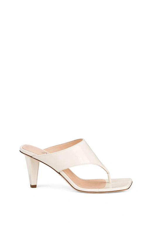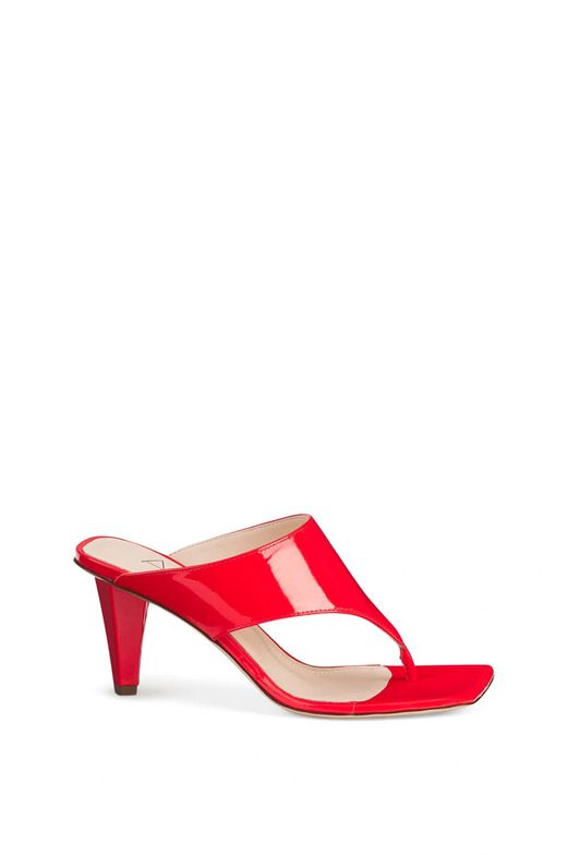 I sandali infradito si caratterizzano per un tacco a cono geometrico di 7 cm rivestito in pelle verniciata, abbinato a una punta squadrata e fondo in cuoio, elementi che conferiscono struttura e personalità. Disponibili nelle varianti burro e rosso acceso, trasformano ogni passo in un gesto di stile audace e sofisticato.