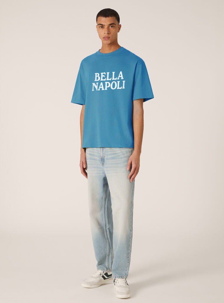 La maglietta, con la scritta “BELLA NAPOLI” stampata sul petto, è un tributo alla bellezza e al carisma della città, oggi al centro della scena sportiva internazionale. Disponibile da subito nel flagship store di Via Toledo, sarà affiancata da un’installazione in vetrina interamente dedicata a questo storico momento.
