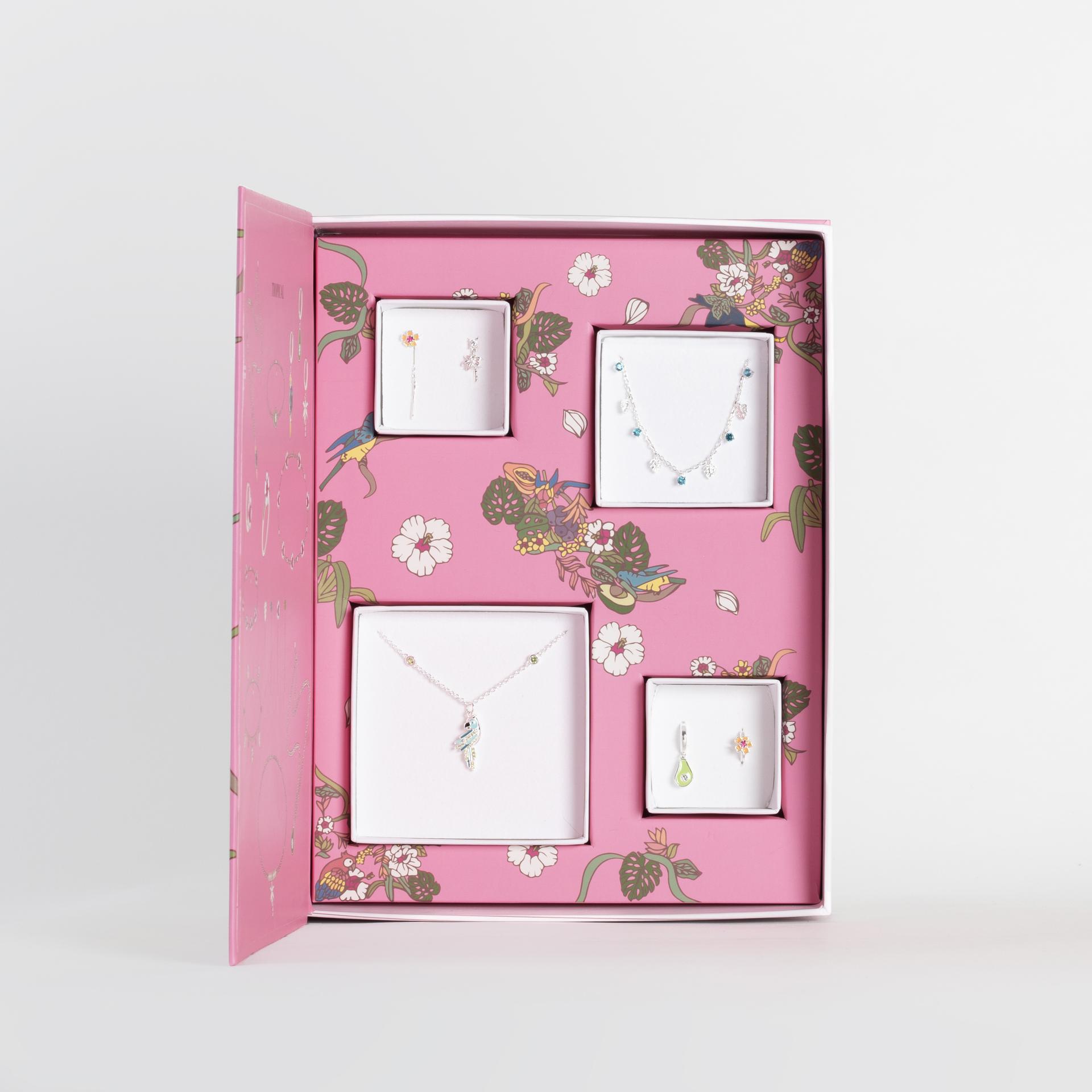 La collezione Tropical è disponibile anche nella versione Volume, composta da Lovli Ibisco, Hoop Ibisco, Hoop Avocado, Orecchino Palma, Bracciale Amazzonia Turchese e Collana Rio.