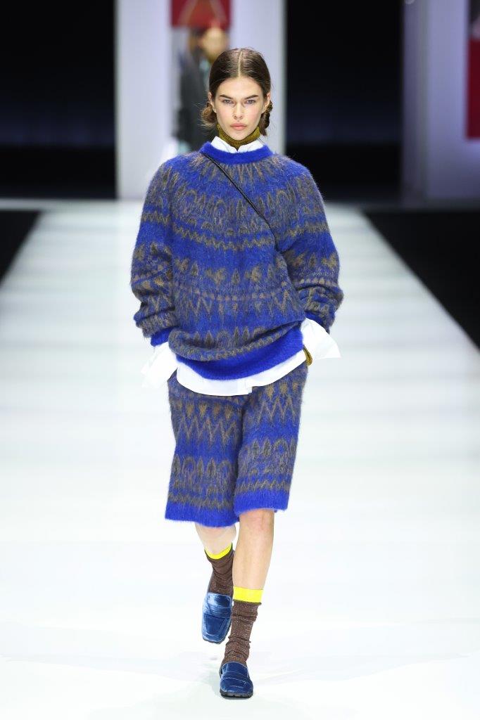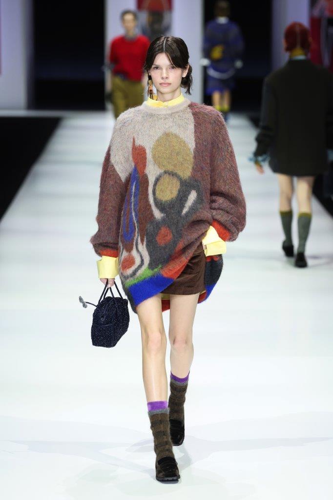 L’iconico motivo bidimensionale delle opere di Kato prende vita nel knitwear , mentre tecniche come il polka dot e lo stamping aggiungono un tocco nostalgico e ribelle. La palette cromatica si arricchisce di tonalità autunnali e invernali, con verdi, marroni, sabbia, giallo, cammello, e tocchi di ciliegia e viola. Texture come cashmere, velluto, mohair e mesh si fondono con materiali innovativi come fleece, nylon e bouclé, offrendo un’esperienza sensoriale unica.