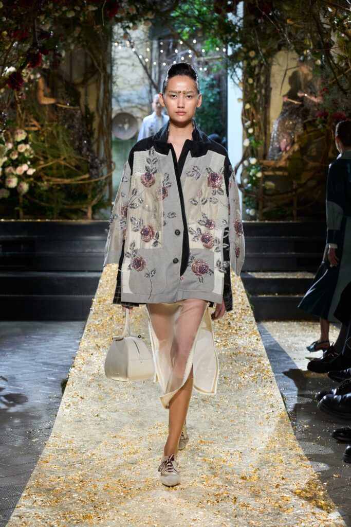 Nei merletti, accenni di rosso carminio e bordeaux disegnano rampicanti di rose su fondo ecrù. Intarsi, velluti, damaschi e broccati si alternano su parka reinterpretati, kimono e ancora giacche sartoriali maschili, giacche serie limitata realizzate con pezzi di altre giacche dimenticate e ritrovate e poi riassemblate e incastrate di rose ricamate.