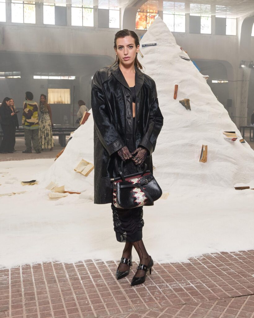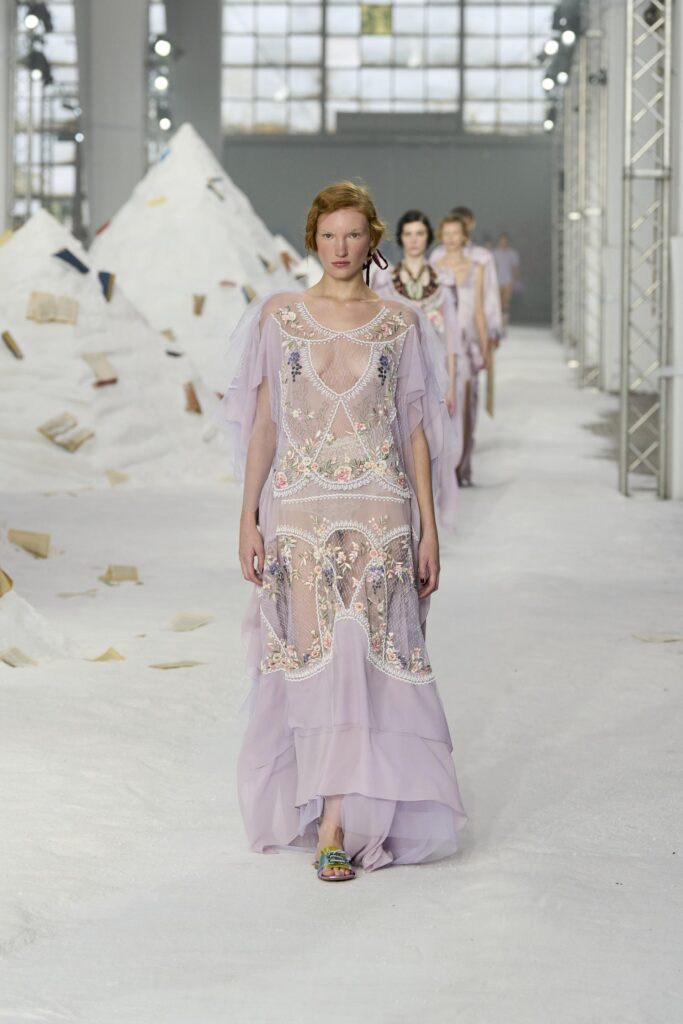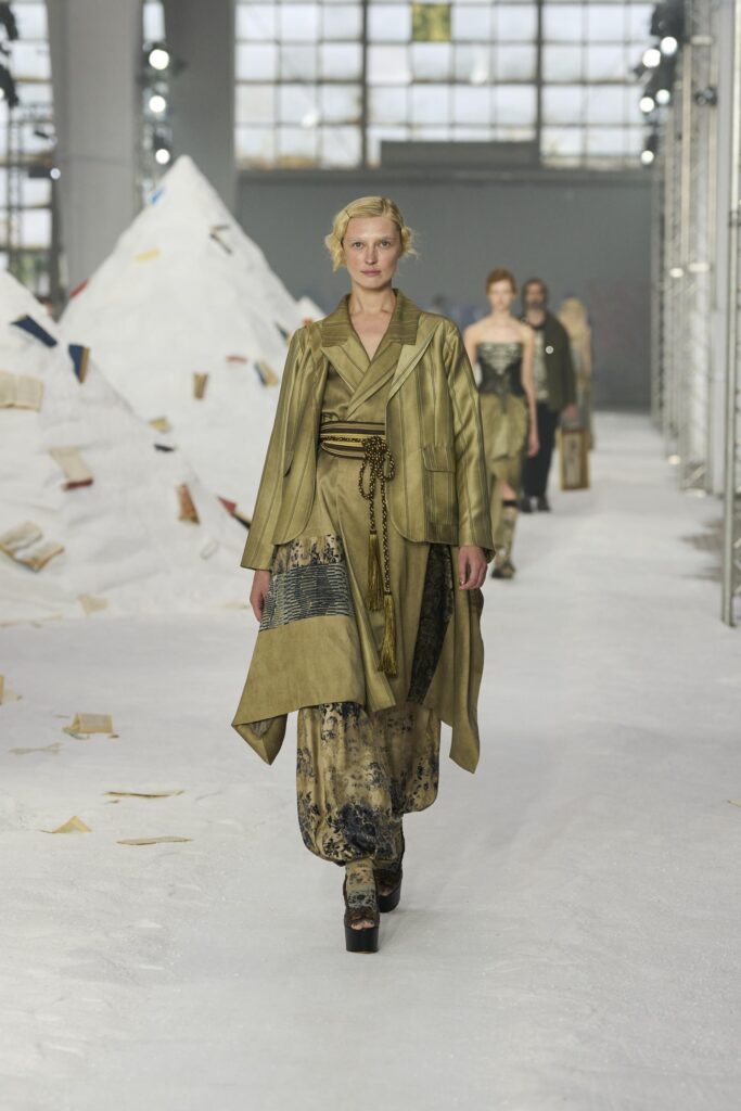In passerella si alternano vestaglie degne di dive hollywoodiane e capi maschili dal taglio sartoriale, tailleur e abiti da soirée, caban oversize e giacchine sagomate. Non mancano completi pigiama, maglieria che sembra ricamo, denim accostato a tessuti preziosi.