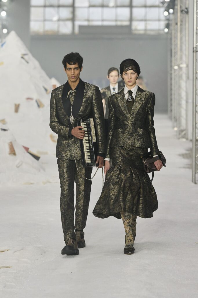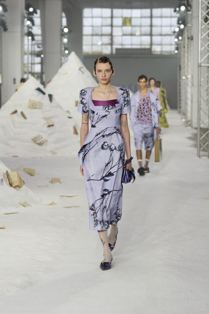 La palette cromatica è soffusa e avvolgente: lilla, rosa cipria, ecrù, sabbia, rame, bronzo, prugna, fino al nero stinto. I tessuti raccontano un viaggio estetico: check e gessati, jacquard e damaschi, pizzi, pois, rose sparse come bouquet, tappezzerie scolorite. Uomo e donna condividono gli stessi materiali, ma in interpretazioni diverse: perché per Marras la regola è superare le regole.