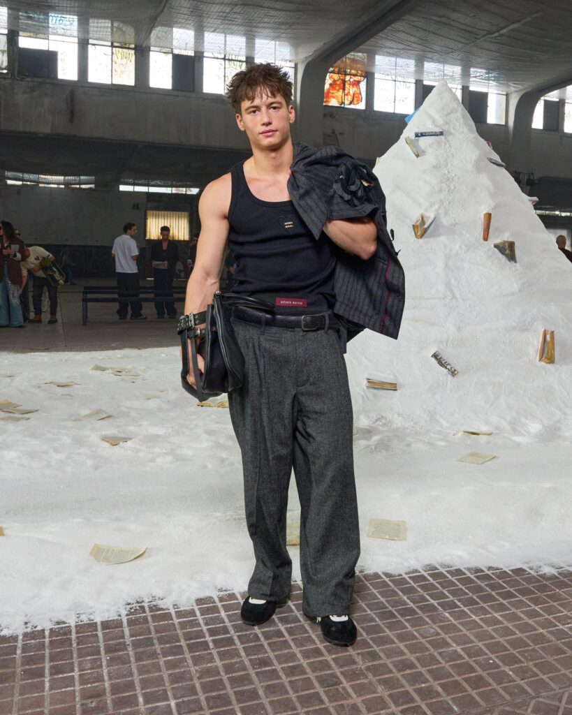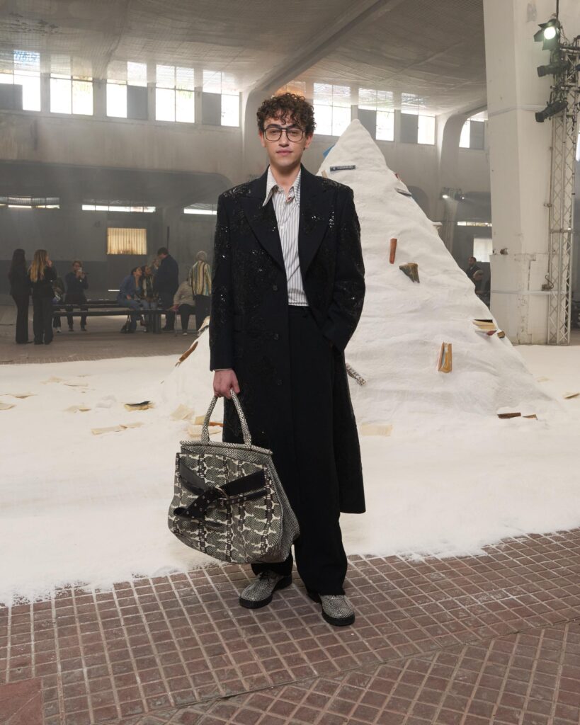 La sfilata si chiude con un tributo alla Sardegna e ai suoi custodi: il pastore Giuseppe Ignazio Loi, protagonista del film La vita va così di Riccardo Milani, che per decenni ha rifiutato di vendere la sua terra a un grande gruppo immobiliare. Un gesto che incarna la resistenza, l’amore per le origini e la difesa della bellezza: valori che Marras fa propri e porta in passerella.
