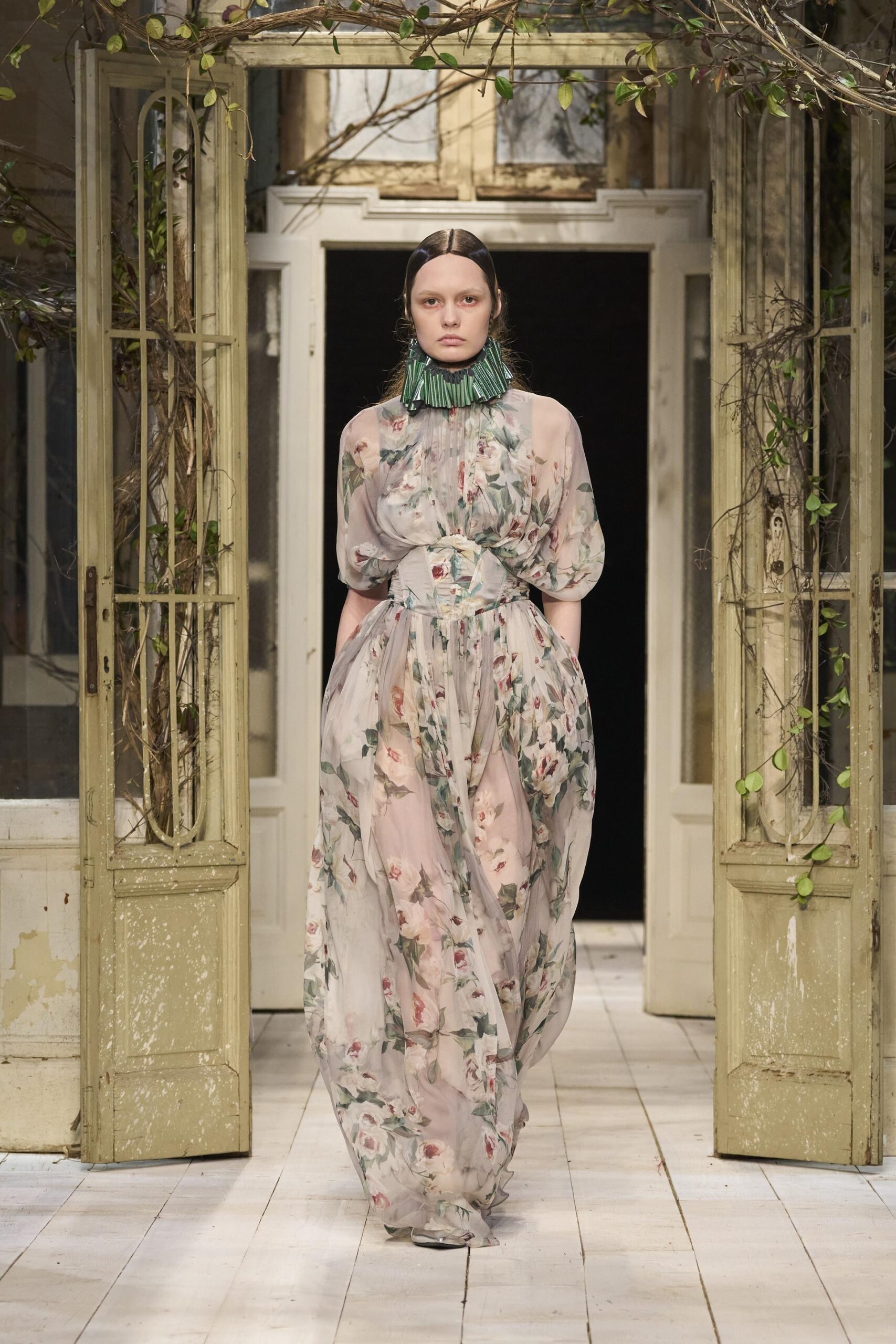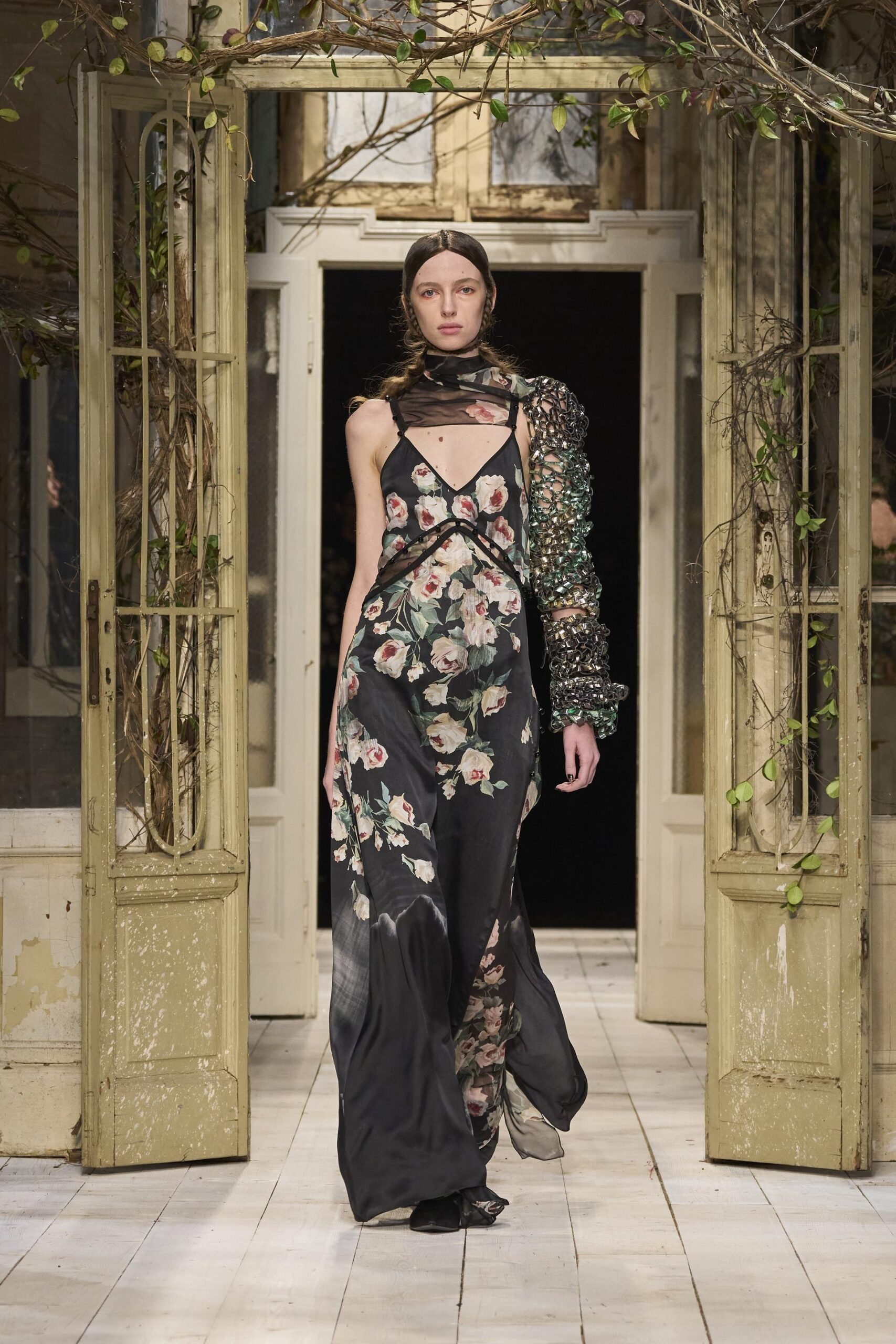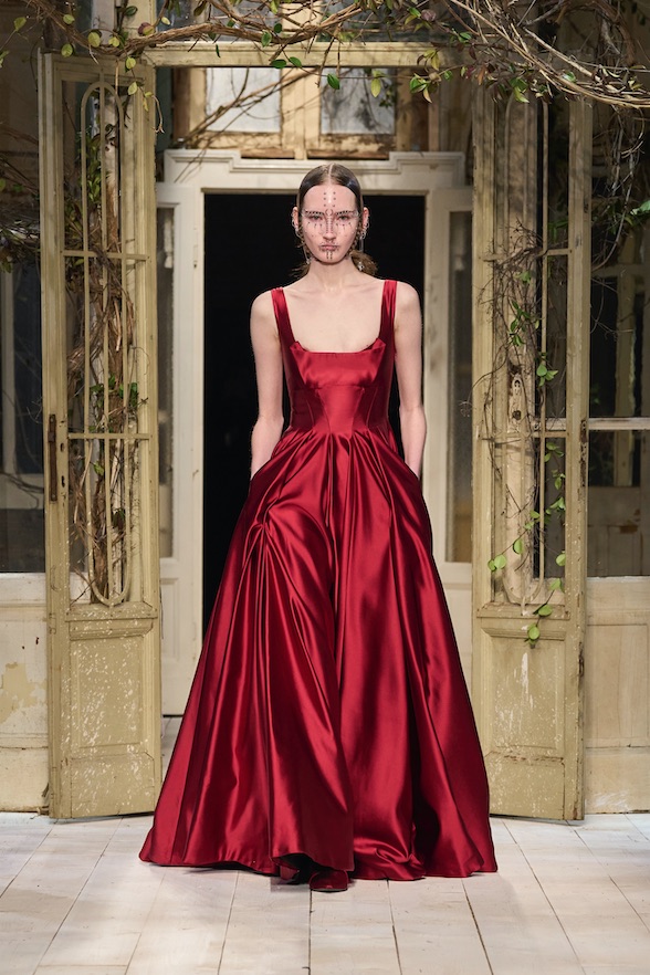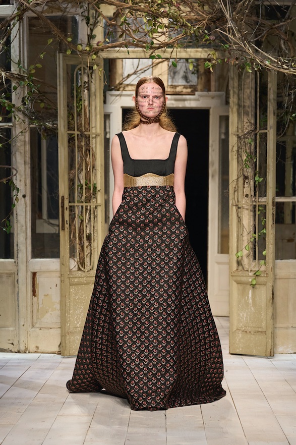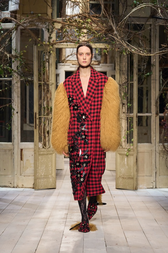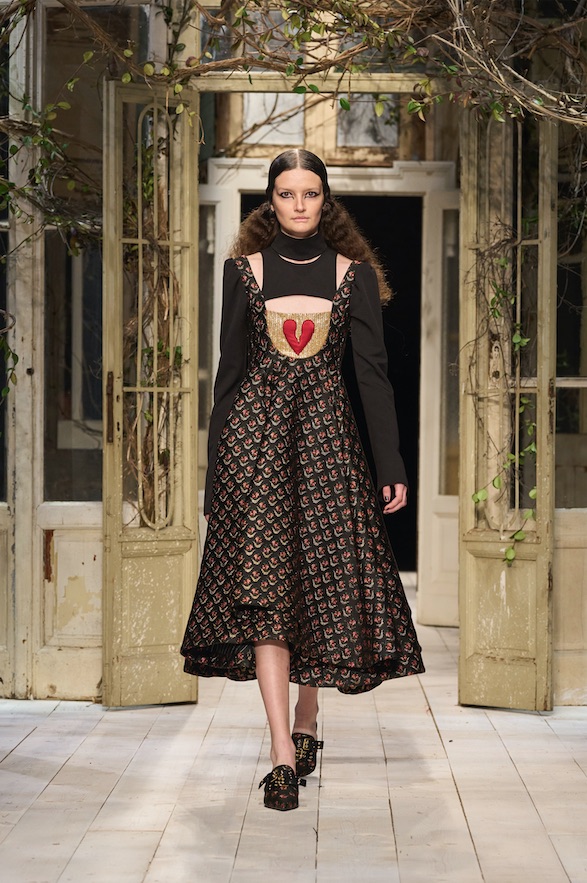 Montoni importanti e pelle stretch invecchiata e pelle colorata o shining, cerniere, spille e fibbie. Maglie decorate, jacquard paesaggio, maglie accoppiate con jais, argyle, trecce e intarsi. Abiti scivolati o a campana, capispalla autoritari, mantelle, giacche over o piccolissime, pantaloni cargo o dalla vita altissima, bustini, gonne drappeggiate e tante, tantissime camicie bianche. I colori sono i verdi del sottobosco, il giallo, il rosso, l’oro e il nero.