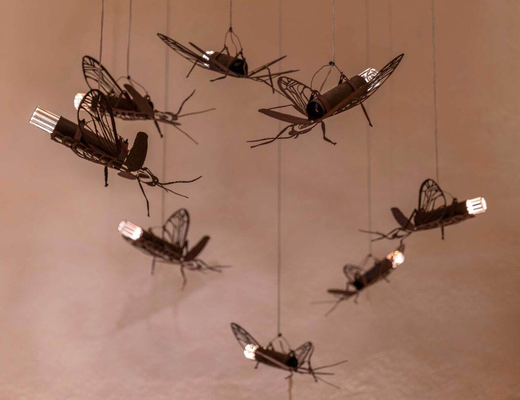 Parallelamente, la ricerca si è estesa alla progettazione di lampade in ferro, tra cui installazioni ispirate alle lucciole. Strutture leggere e luminose hanno evocato il mondo naturale attraverso forme stilizzate, trasformando il metallo in elementi poetici sospesi nello spazio. La lucciola, simbolo di fragilità e resilienza, è diventata metafora di una natura in equilibrio precario ma ancora capace di esprimere bellezza e trasformazione.