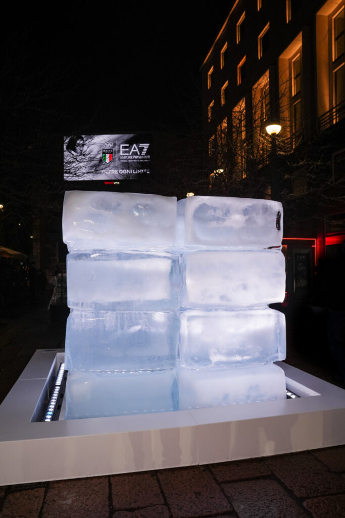 Il debutto ufficiale delle attivazioni EA7 è stato celebrato con un evento esclusivo presso lo store Emporio Armani Milano, trasformato per l’occasione in un’esperienza immersiva ispirata all’energia dei Giochi Invernali. Dalla facciata illuminata da suggestivi giochi di luce al grande cubo di ghiaccio collocato in via Croce Rossa – destinato a sciogliersi lentamente per svelare le divise dell’Italia Team – ogni dettaglio ha contribuito a raccontare la visione del brand.