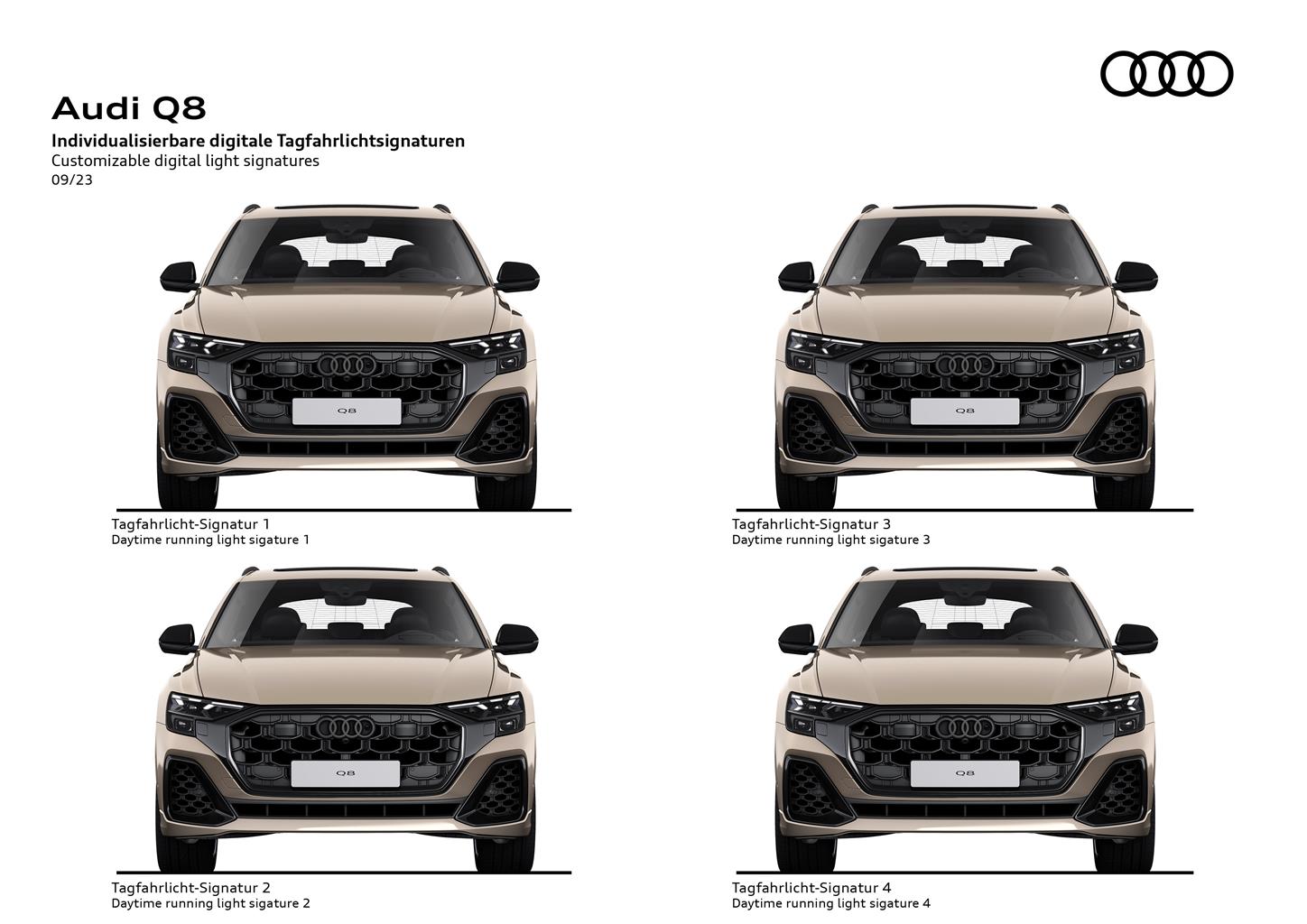Audi presenta la nuova Q8, per la prima volta dotata di proiettori a Led) Matrix Hd con spot laser corredati di molteplici firme luminose, cui si accompagnano gli inediti gruppi ottici posteriori con tecnologia Oled. La vettura, che coniuga il carattere di una coupé a cinque porte e la versatilità di un grande suv, può contare su ampie possibilità di personalizzazione: per esempio si può scegliere tra otto inserti decorativi, tra i quali le novità in carbonio twill opaco e alluminio spazzolato opaco color argento. Al lancio, la vettura è proposta con due motori diesel e un propulsore a benzina che erogano rispettivamente 231 cavalli e 500 Nm, 286 cavalli e 600 Nm, 340 cavalli e 500 Nm di coppia. Nel 2024 debutterà la versione plug-in hybrid. Q8 arriverà nelle concessionarie italiane nel corso del quarto trimestre 2023.