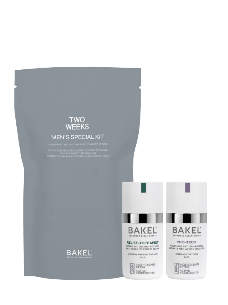 Novità BAKEL MEN’s SPECIAL KIT. Trattamento anti-età di 2 settimane, pensato per il post-rasatura. Ideale per calmare e idratare le pelli sensibili e reattive. Il kit contiene: 1 Siero RELIEF-THERAPIST – Charm Size (10 ml) 1 Crema PRO-TECH – Charm Size (15ml) Prezzo speciale 65,00€uro