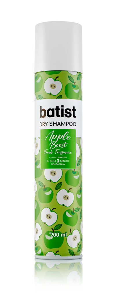Batist dry shampoo Apple Boost, incredibilmente fresco e delicato, grazie alla mela verde che rende i capelli leggeri e profumati, a prova di call last minute.