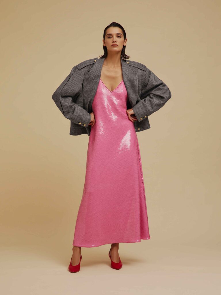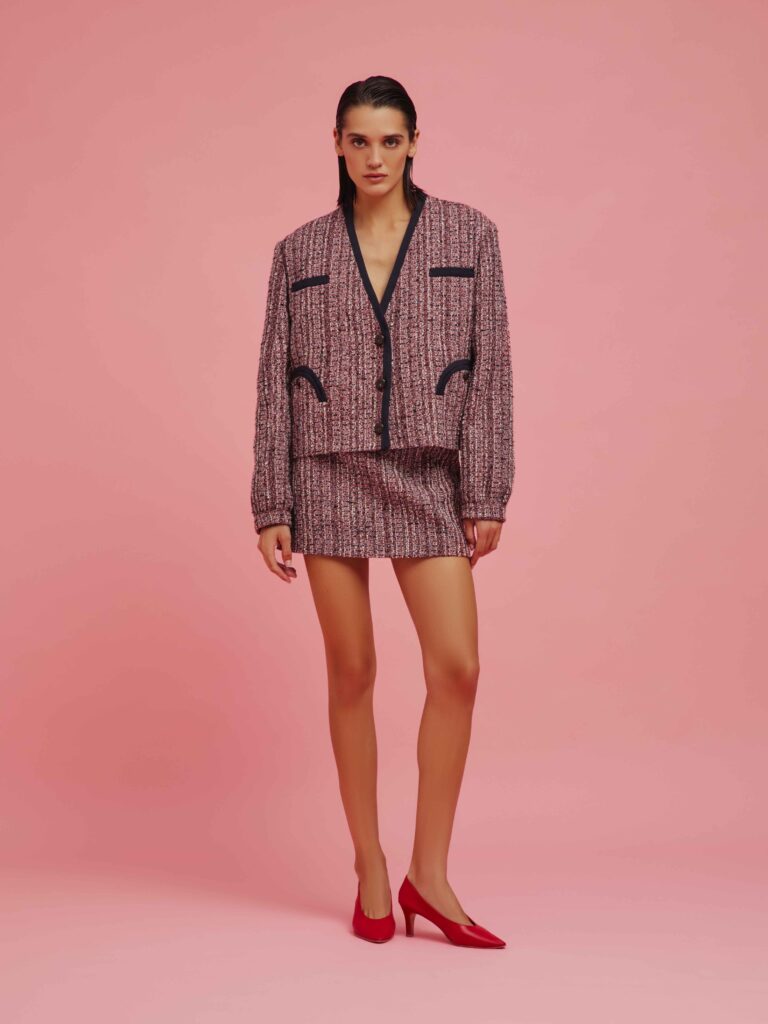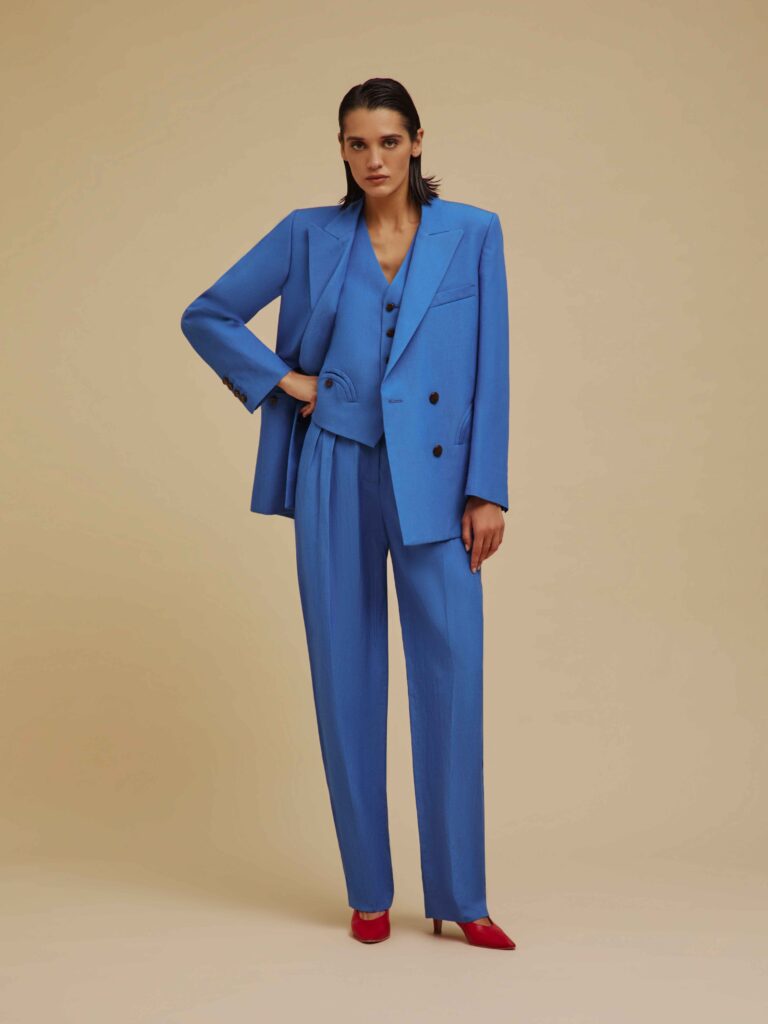 A colorarsi di rosso è anche il beachwear, introdotto in collezione da questa stagione estiva: il bikini si arricchisce di una placca tartarugata, mentre il modello intero ha una sgambatura e uno scollo profondo, a riecheggiare l’estetica degli Anni 80, quando persino la principessa Carolina di Monaco si faceva fotografare da Helmut Newton, immersa in una piscina, i capelli bagnati tirati all’indietro, il viso imperlato d’acqua e un collier prezioso a incorniciarne la bellezza aristocratica, algida e però venata di malia. Il tributo agli Anni 80 riecheggia nei volumi boxy delle giacche, come la Lola Jacket, bolero con revers maschili, e nelle gonne strette in vita con abbottonatura centrale, con pence profonde, così come negli Shamo bolero melange e maxi bottoni dorati. La contemporaneità risultante è figlia della scelta dei tessuti naturali, lini, sete e viscose dalla morbidezza fluida, indossabile senza sforzo 24/7, dall’ufficio al beach club. È il caso del gessato estivo con righe color salvia, in lino, viscosa e seta, declinato nel modello Everyday blazer sfoderato, da indossare con gli Husul shorts, così come nell’Everynight blazer in seta, lino e cotone, che richiama il tessuto operato degli asciugamani da sfoggiare sulla riva.