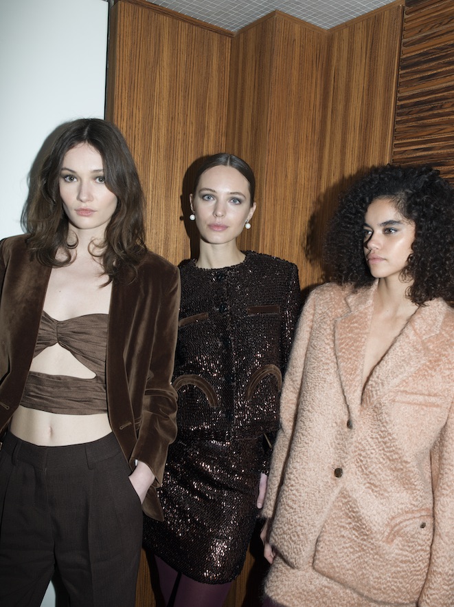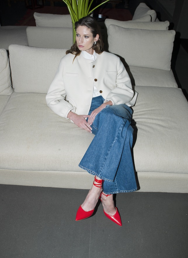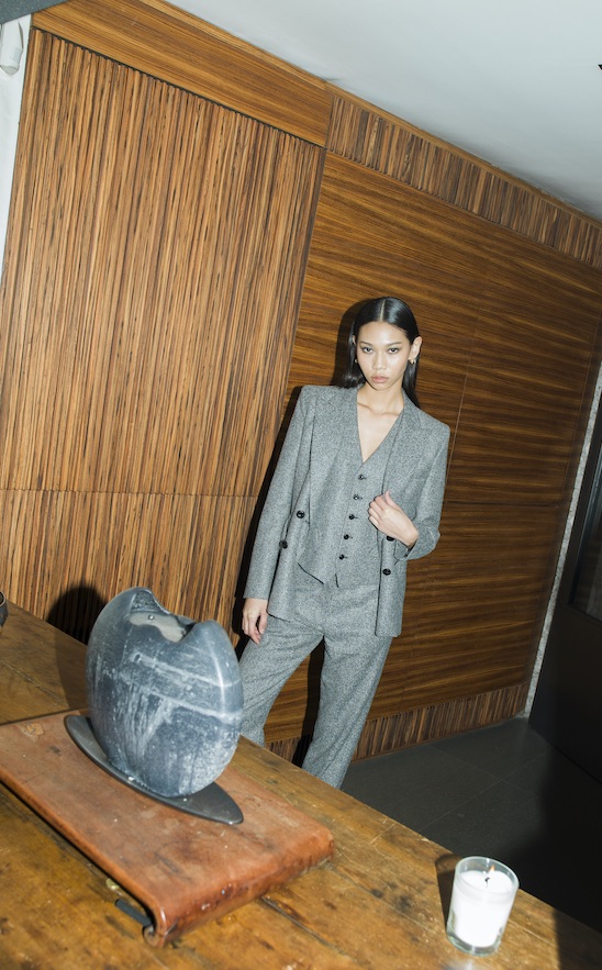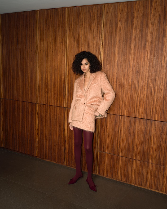 A suo agio con l’armadio di lui, di cui modifica lunghezze e volumi per adeguarli alle sue esigenze, per il giorno i tessuti spigati si spalmano su Serama bomber e longuette, mentre blazer in lana micro-check si abbinano alle maglie serafino e pantaloni in pelle essenziali nelle silhouette. Le vibrazioni bon chic bon genre si sentono chiaramente nel Petra blazer in mohair di lana rosé con minigonna abbinata, o nel cappotto Afterglow in velluto liquido, con collo alla coreana, da indossare di sera. Ad aggiungere spessore e strati, ci sono i continui rimandi al mondo dell’eleganza maschile, come nei gilet con bottoni effetto tartaruga da indossare sopra le camicie e le polo, oppure in montone dall’approccio più utility con i quali coprire il blazer.