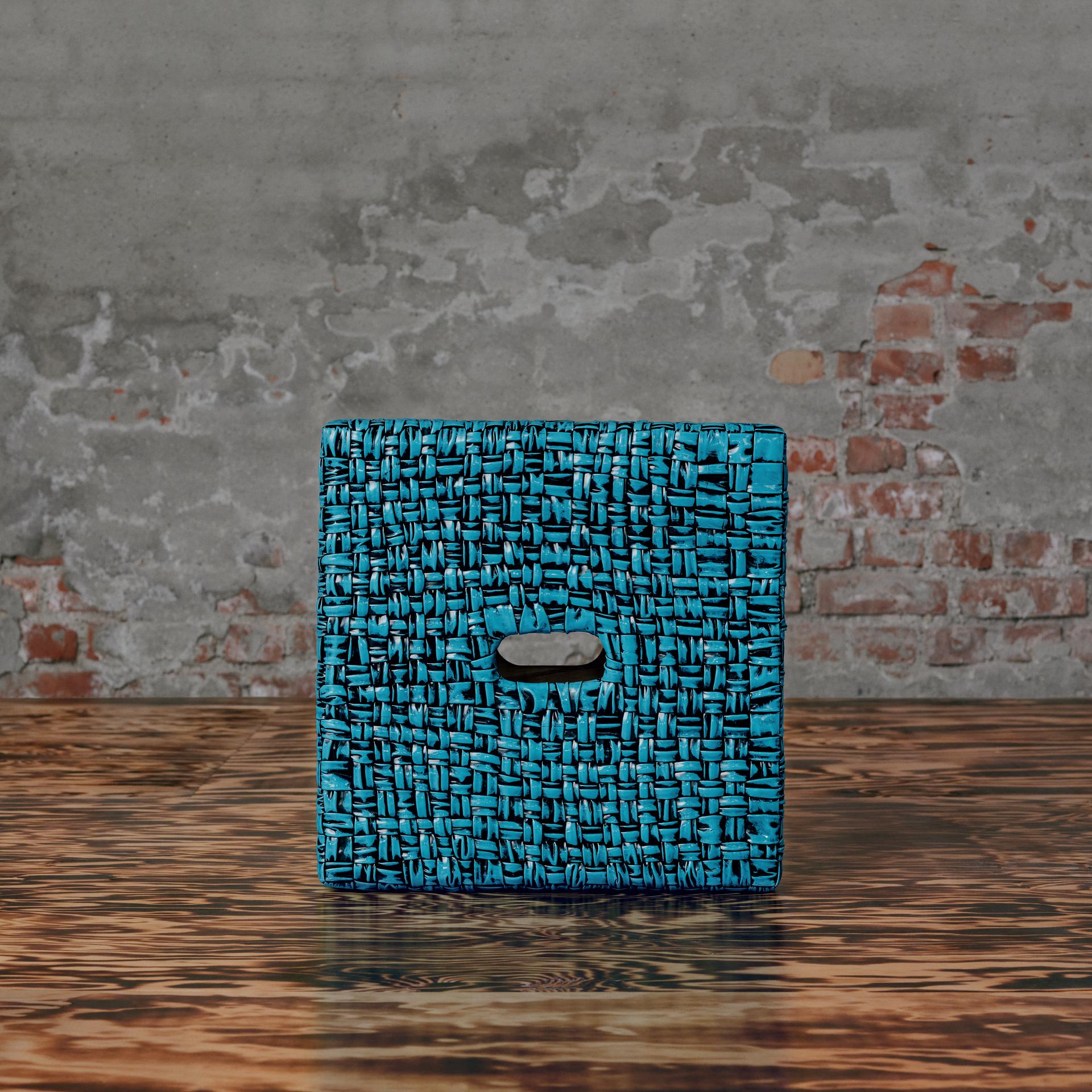 I modelli in pelle sono disponibili in quattro colori: rosso, giallo, blu e verde. Ognuno di questi pezzi è interamente rivestito con la tecnica Intreccio foulard di Bottega Veneta, realizzata a mano dagli artigiani nell’atelier di Montebello Vicentino. Una speciale tecnica di pennellatura ricopre la pelle con vernice colorata, seguita poi da uno strato di vernice nera che viene parzialmente rimosso per creare una finitura unica e testurizzata, che rende ogni pezzo un esemplare irripetibile. Sono disponibili per l’acquisto 60 Tabouret in pelle e 100 in legno.