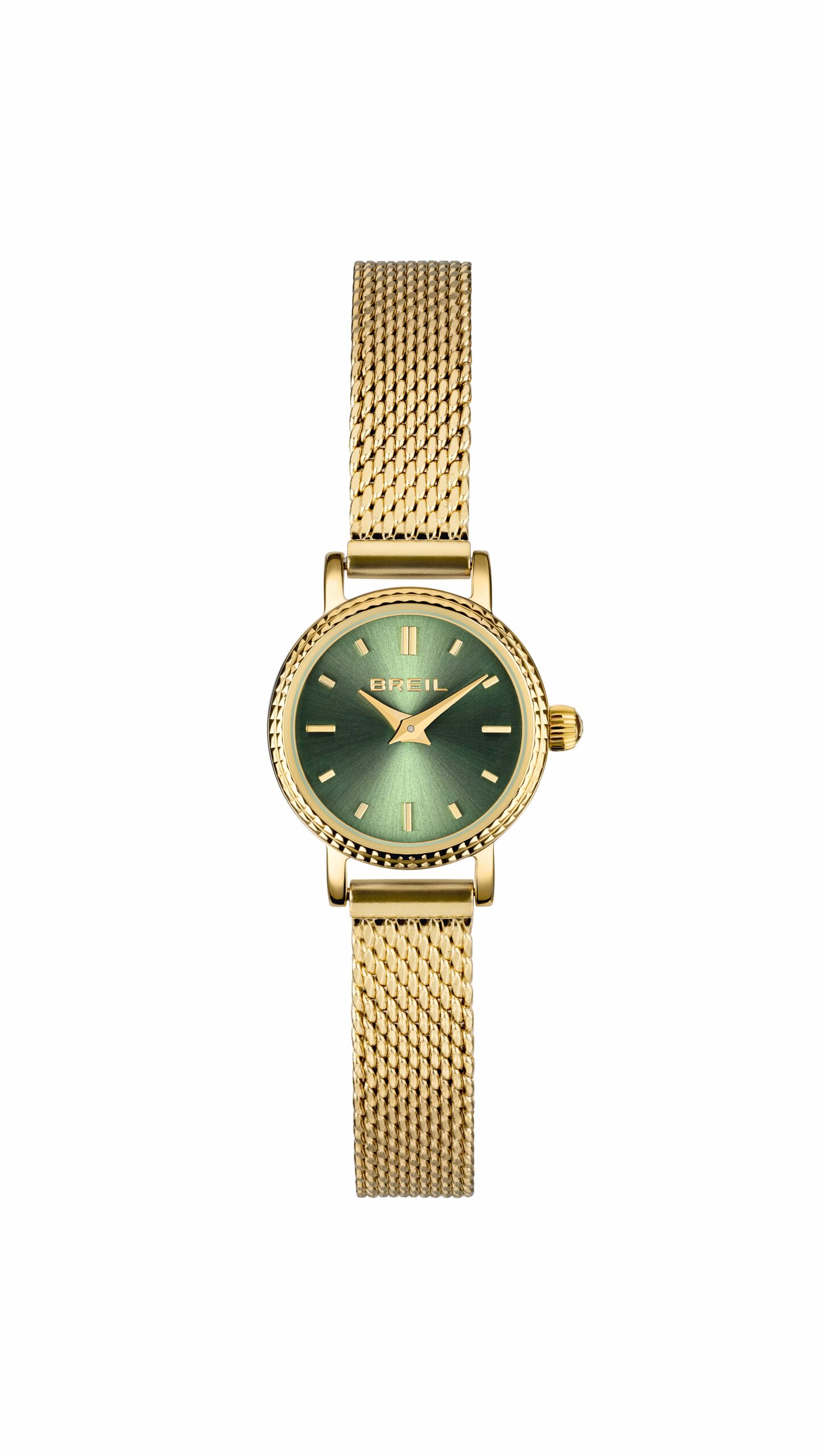 I delicati gioielli da polso scelgono piccole e leziose casse d’acciaio rotonde del diametro di 18 mm impreziosite dalla lunetta lavorata con un effetto cesellato che riflette la luce e crea tridimensionalità. La corona zigrinata aggiunge un tocco raffinato all’orologio. I quadranti dal design essenziale con lavorazione effetto sunray, presentano indici a bastone per indicare le ore, a ore 12 il logo Breil.