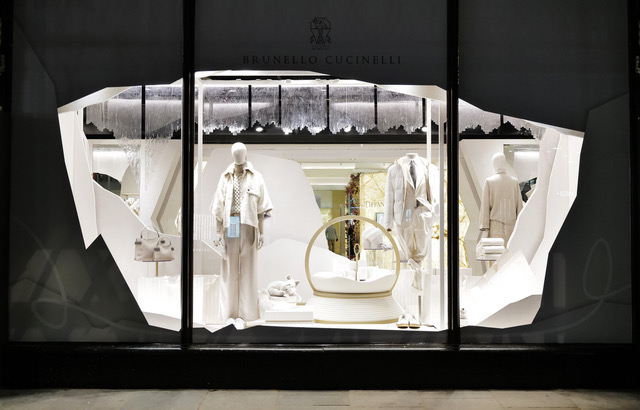 Le vetrine raccontano attraverso gli allestimenti tutti in bianco il fascino di Solomeo, il Borgo Medievale dove ha sede l’azienda.