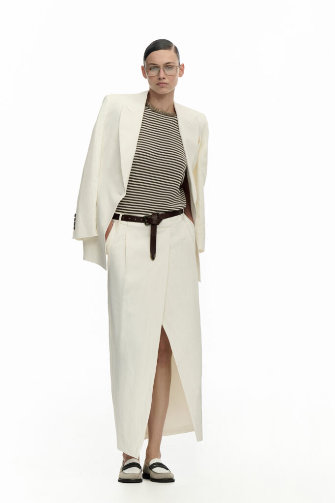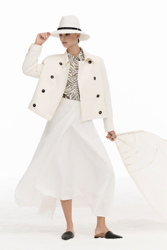 Il viaggio stilistico compone un mondo elegante e rilassato, ricco di contenuti sartoriali e artigianali, attraversato da contaminazioni, empatia e connessioni. Gli elementi più preziosi acquisiscono uno spirito disinvolto, mentre il vestire quotidiano si eleva verso un’estetica essenziale e raffinata.