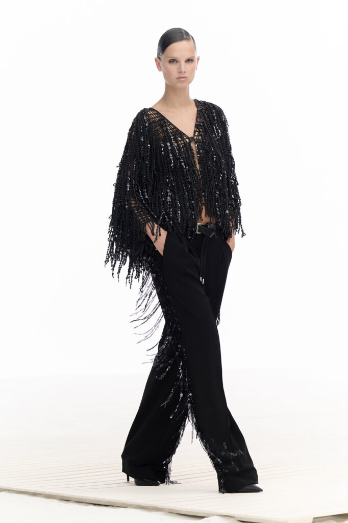 La maglieria è il punto di riferimento dell’esplorazione e della sperimentazione: punti a rete giocano con geometrie morbide, volumi impalpabili sono percorsi da ricami effetti craquelé, preziosissimi macramè danno vita a fantasie tridimensionali. Il filato rinasce ancora, prezioso e naturale, libero o intrecciato, come raffinata disegnatura, frangia raw sparkling o fluida texture metallica.