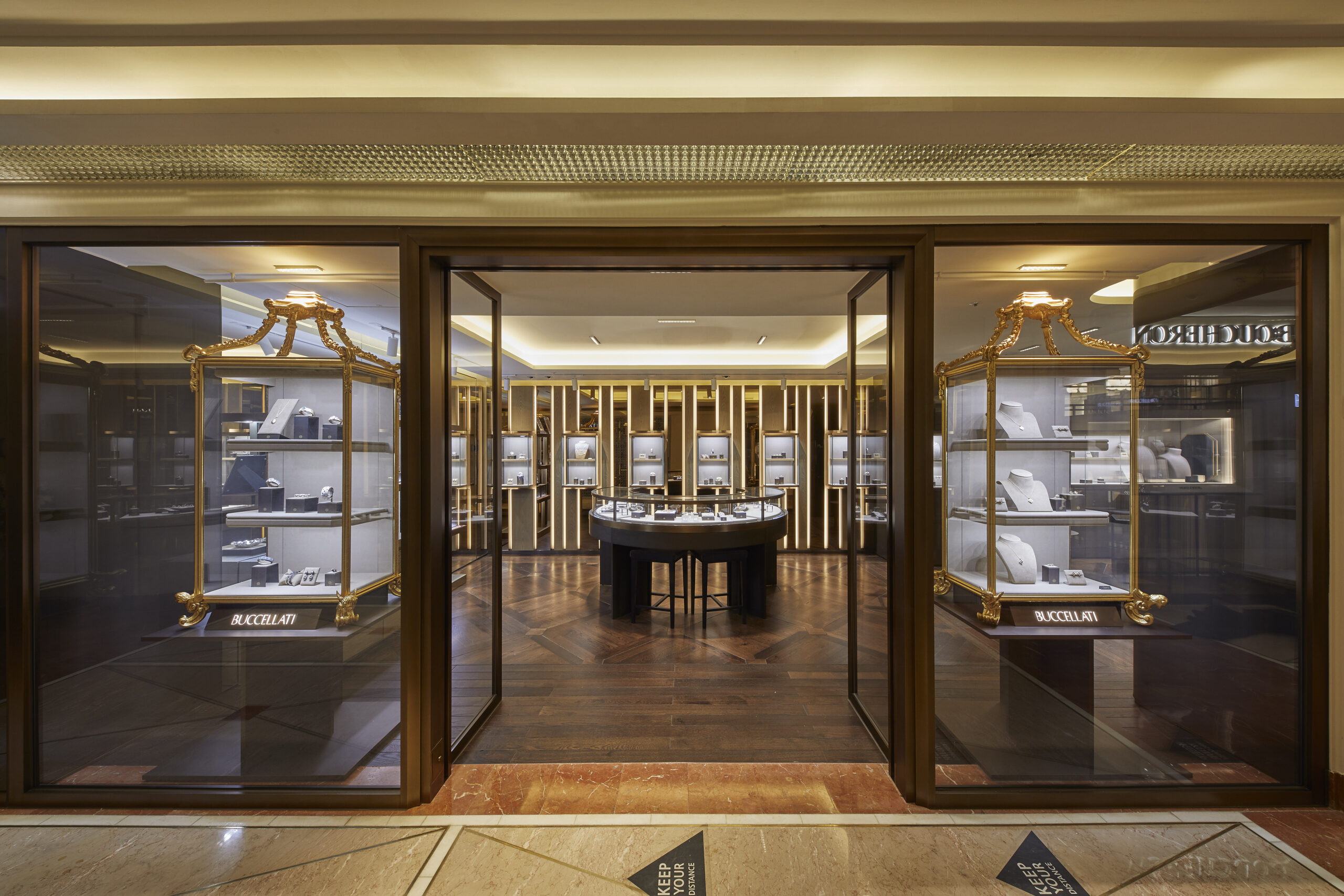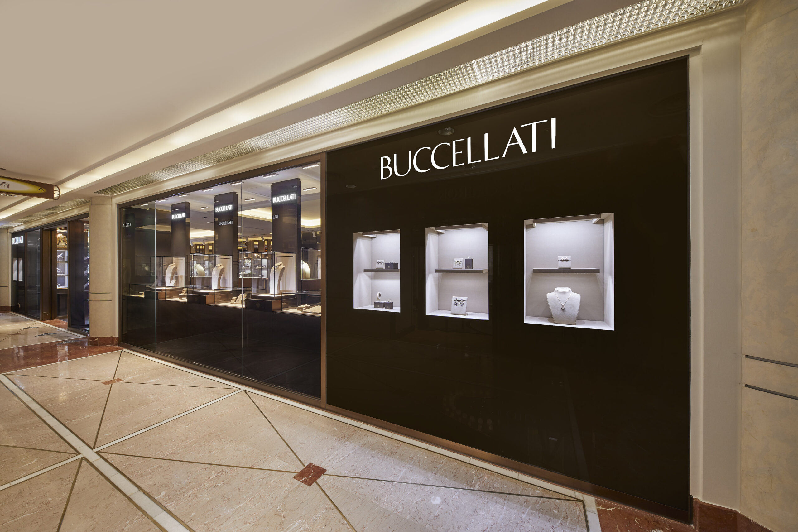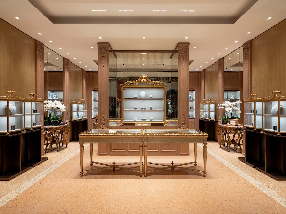 La nuova boutique Buccellati razionalizza lo spazio con grandi banchi espositivi, alti specchi e scaffali verticali, tutti decorati con legno preziosamente intagliato e le iconiche vetrine storiche Buccellati decorate in oro. Anche questa boutique comprende anche una sala privata per accogliere i clienti VIP.