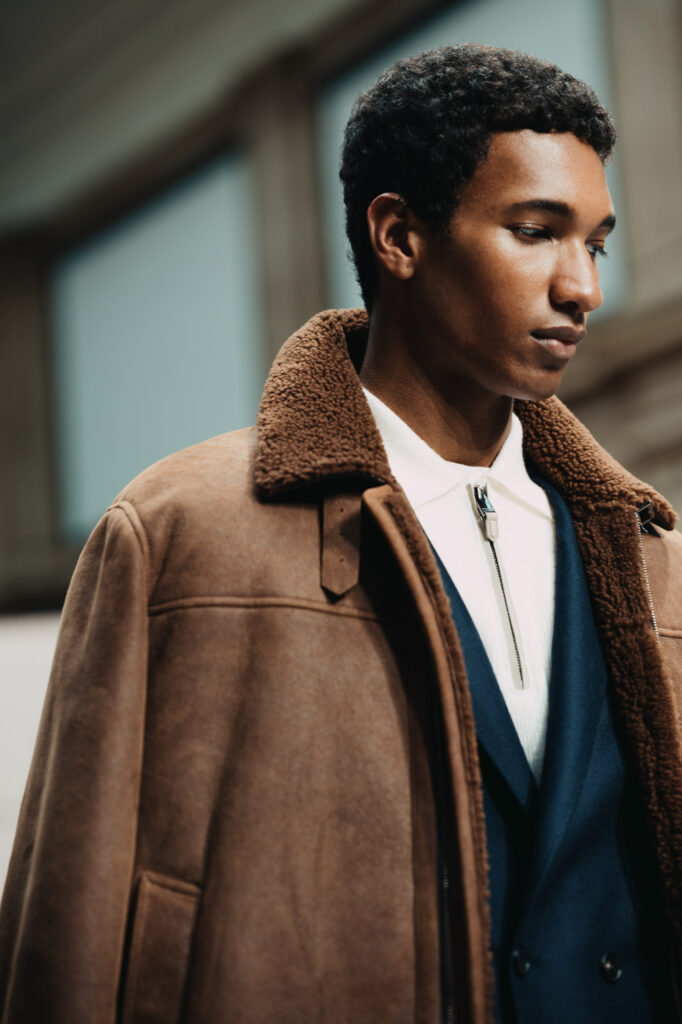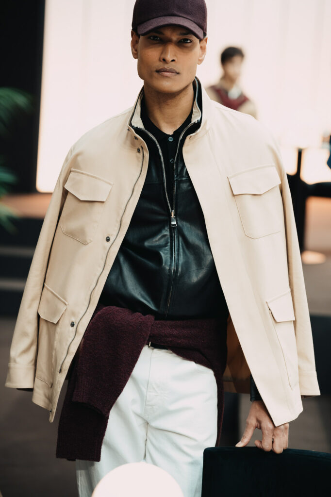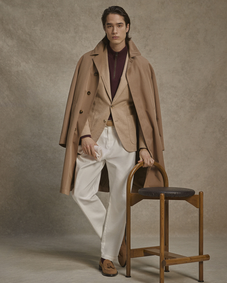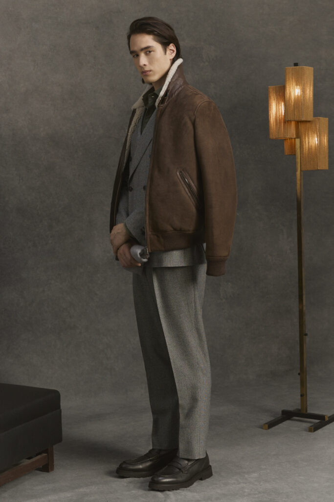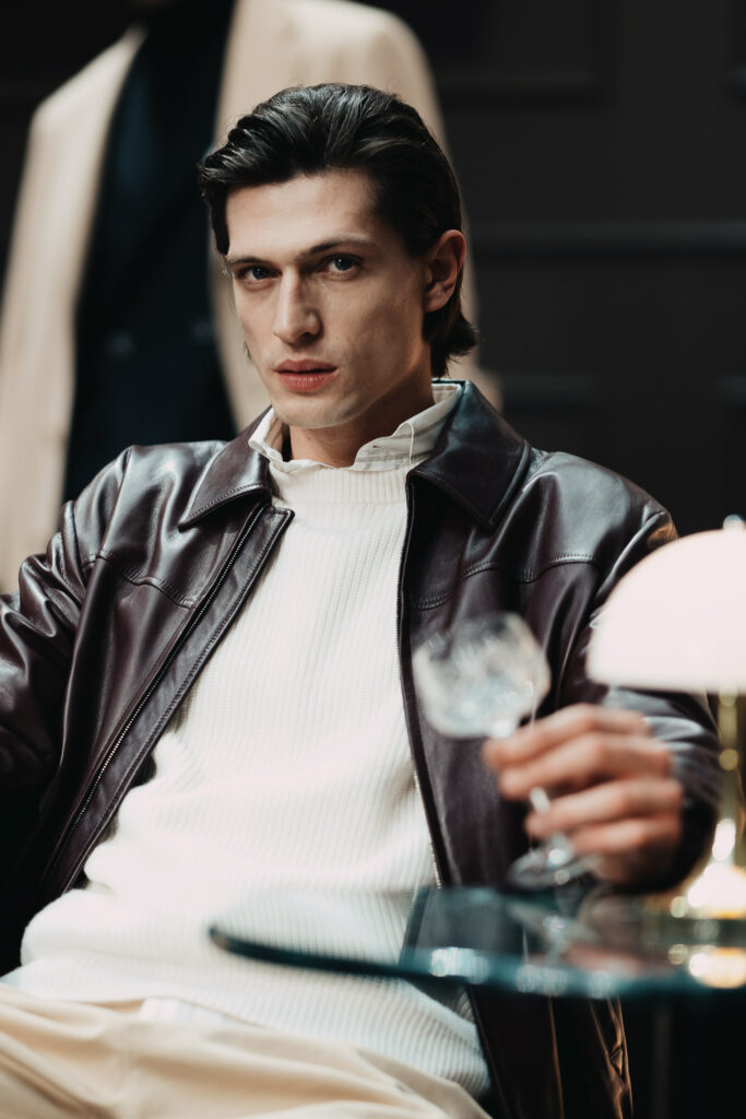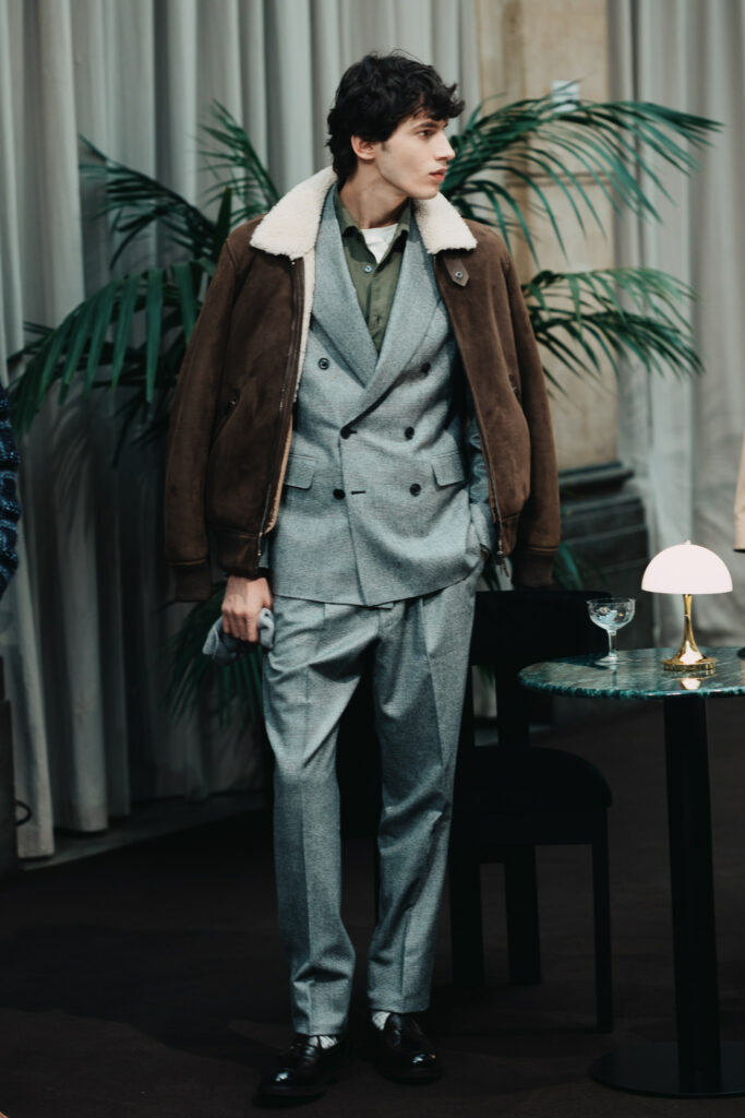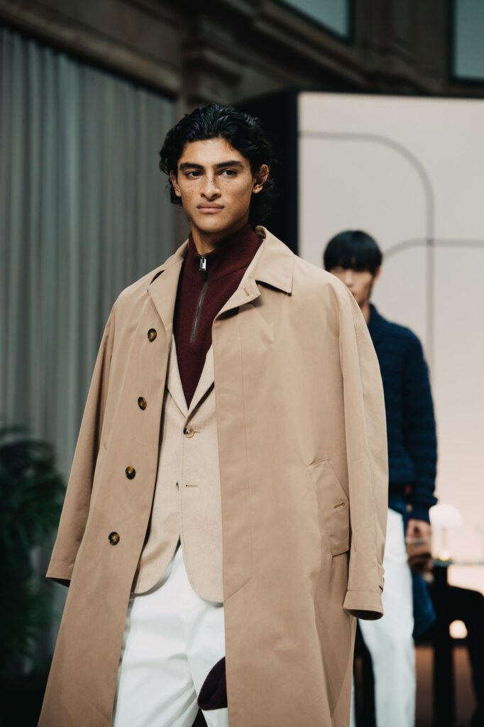 Abito e giacca restano il fulcro di un guardaroba trasversale, capace di muoversi con naturalezza tra formale e informale. L’outerwear si rinnova con la stessa precisione di un gesto calibrato: giacche in cashmere e vicuña, cappotti in puro cashmere e trench dai volumi più ampi convivono con capi di ispirazione utility, come la quattro tasche in lana e seta o la giacca matelassé, ideale trait d’union tra città e natura. La pelle aggiunge profondità alla collezione, caratterizzando giacche in nappa e bomber in montone, sempre governati da costruzioni impeccabili e da un’attenzione estrema a proporzioni e vestibilità.