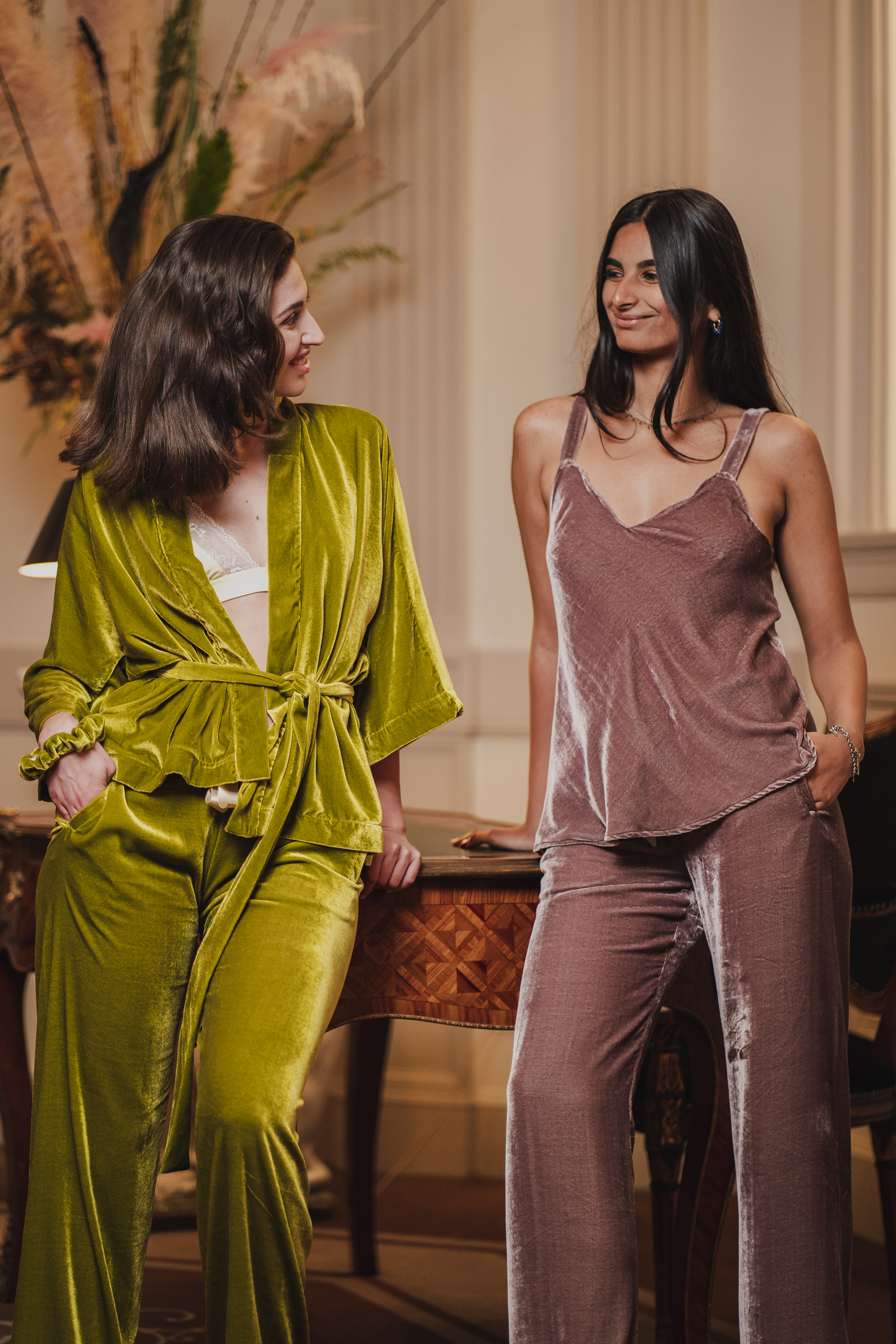 Nella collezione activewear troviamo top, reggiseni sportivi, leggings e shorts in velluto carvico nei colori blu, nero, verde e grigio. Il velluto è il tessuto predominante anche nella collezione loungewear, dove viiene utilizzato il velluto di seta nei pigiami e nei kimoni