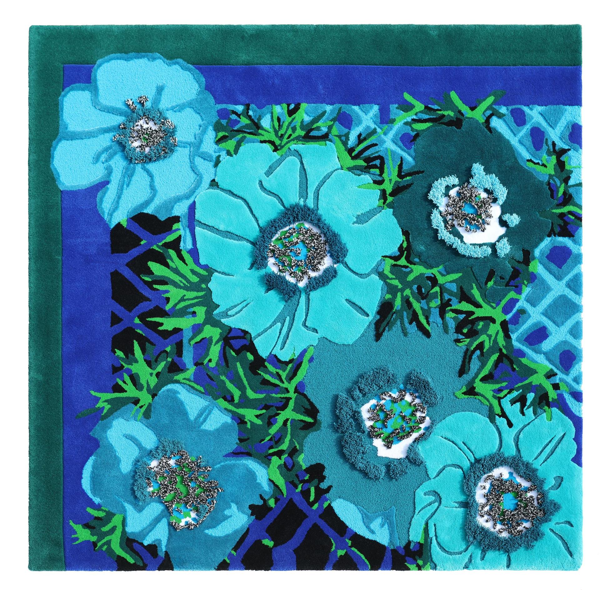 Questi stessi fiori erano stati selezionati dall’artista per realizzare l’etichetta-logo dei suoi capispalla e, ora, grazie a Carpet Edition sono stati trasformati in autentiche opere d’arte per l’interior design.
