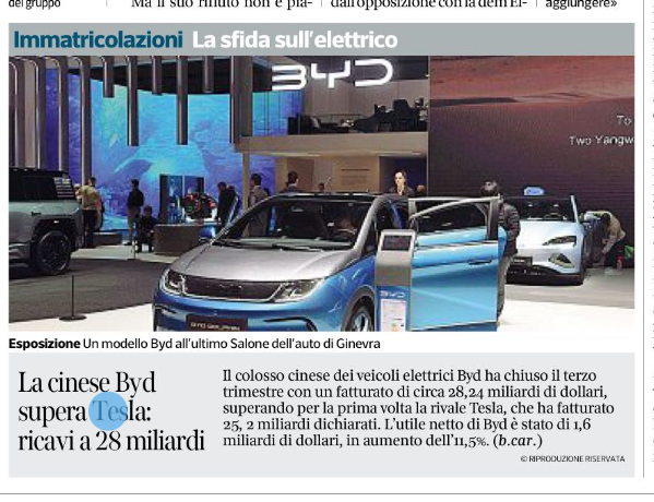 Il colosso cinese dei veicoli elettrici Byd ha annunciato i dati del terzo trimestre 2024 che hanno visto un aumento delle vendite, tanto da aver superato per la prima volta la sua rivale Tesla. Il costruttore ha registrato un fatturato di circa 28,24 miliardi di dollari, superiori ai 25, 2 miliardi dichiarati da Tesla. L’utile […]