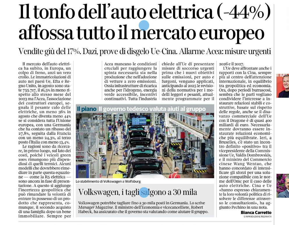 Il mercato dell’auto elettrica ha subito, in Europa, un colpo di freno, anzi un vero crollo. Le immatricolazioni di auto nei paesi Ue, Efta e Regno Unito, in agosto sono state 755.717, il 16,5% in meno rispetto allo stesso mese del 2023 ma l’Acea, l’associazione dei costruttori europei, segnala il pesante calo delle elettriche, un […]