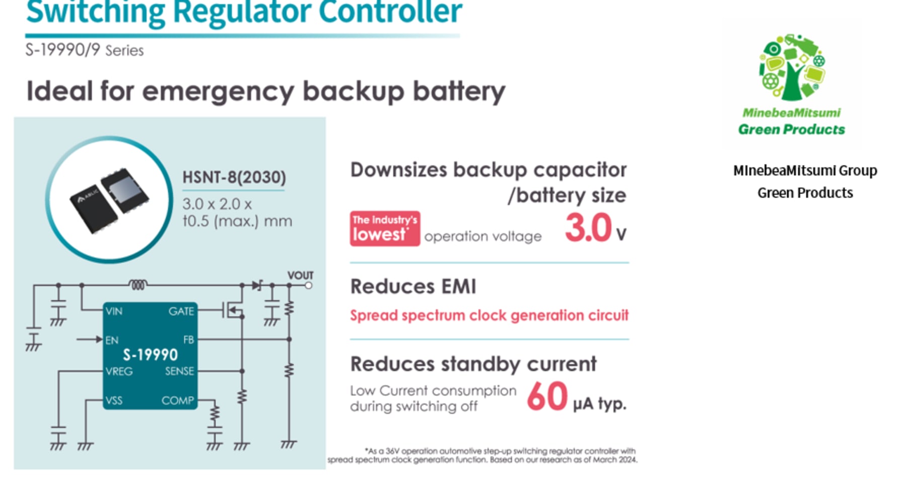 Ablic, una società del gruppo MinebeaMitsumi, ha lanciato la serie S-19990/9 di regolatori di commutazione step-up per autoveicoli da 36 V, disponibili con una frequenza di oscillazione di 400 kHz o 2,2 Mhz. Questi circuiti integrati dispongono della più bassa tensione di funzionamento del settore, a 3V. Inoltre mantengono requisiti di sicurezza sempre più elevati […]