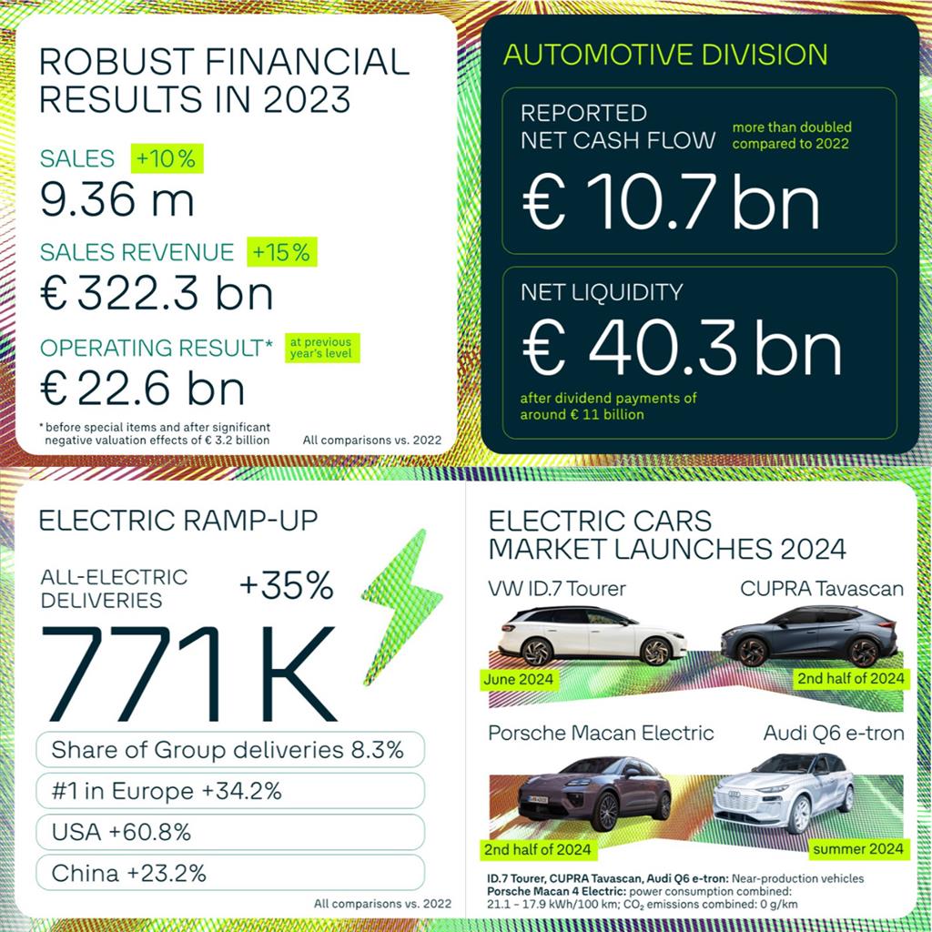 Il Gruppo Volkswagen ha conseguito solidi risultati finanziari nel 2023. I ricavi sono cresciuti del 15% a 322,3 miliardi di euro, trainati da un incremento delle consegne, da un migliore mix di prodotti e da effetti positivi sui prezzi. Le consegne di veicoli 100% elettrici sono aumentate del 35% a 771.000 unità. Il flusso di cassa […]