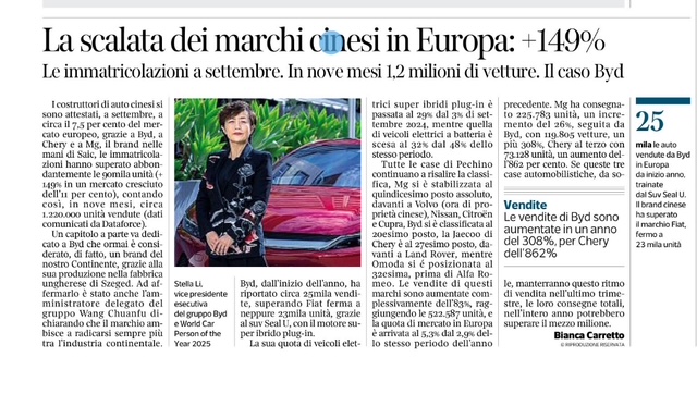 I costruttori di auto cinesi si sono attestati, a settembre, a circa il 7,5 per cento del mercato europeo, grazie a Byd, a Chery e a Mg, il brand nelle mani di Saic, le immatricolazioni hanno superato abbondantemente le 90mila unità (+ 149% in un mercato cresciuto dell’11 per cento), contando così, in nove mesi, […]