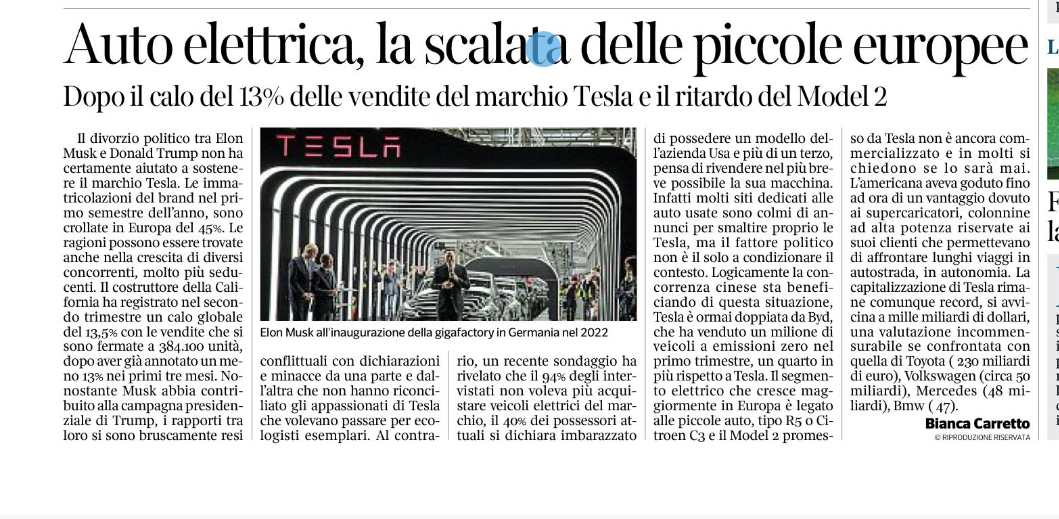 Il divorzio politico tra Elon Musk e Donald Trump, non ha certamente aiutato a sostenere il marchio Tesla, in mano all’imprenditore che vuole partecipare alle prossime elezioni presidenziali di metà mandato. Le immatricolazioni del brand , nel primo semestre dell’anno, sono crollate in Europa del 45%, le ragioni possono essere trovate anche nella crescita di diversi concorrenti, molto più […]