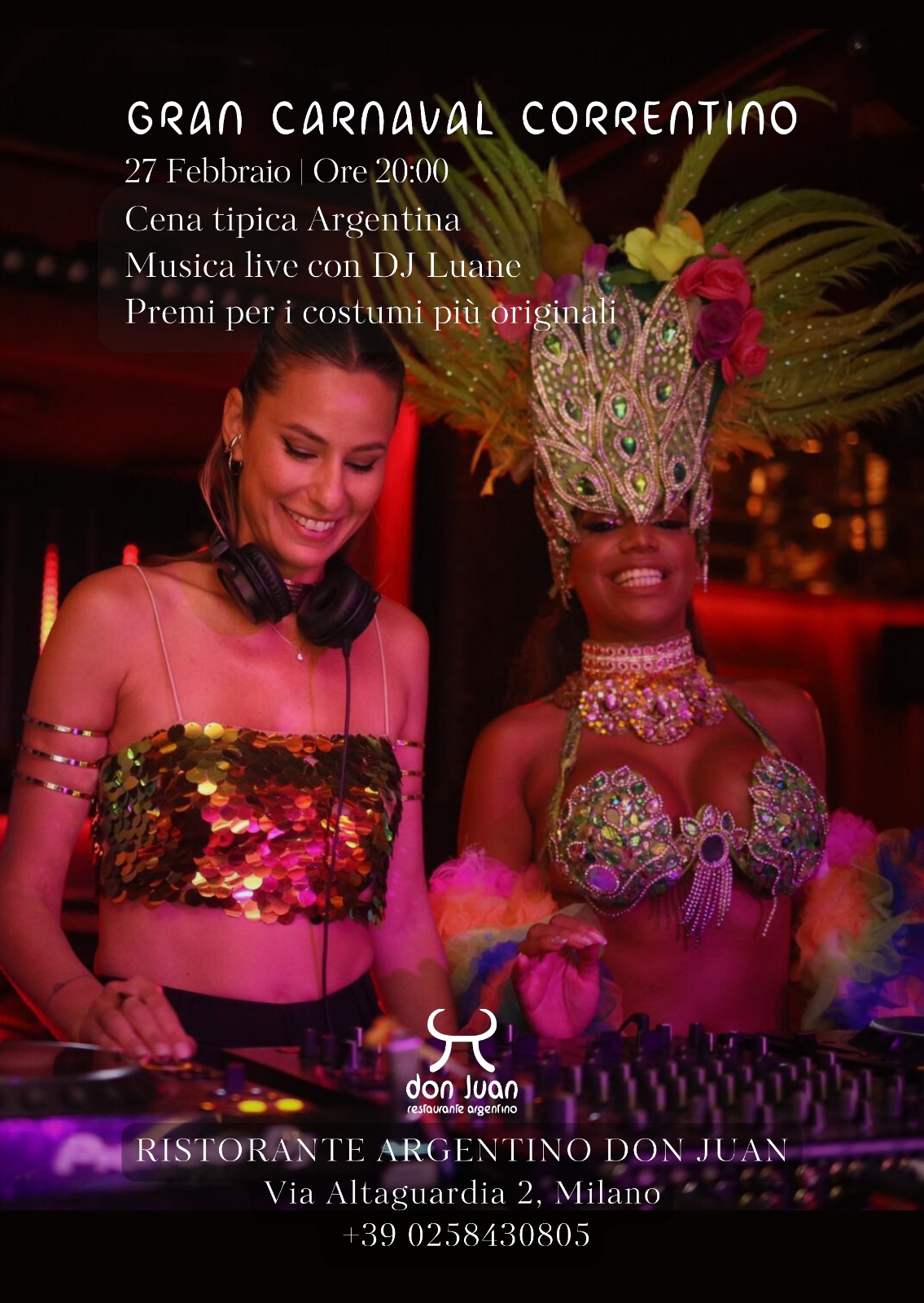 Giovedì 27 febbraio alle ore 20 il ristorante Don Juan sarà pronto ad accogliere i suoi clienti per una serata speciale. L’unione e la passione delle tradizioni del Carnaval de Corrientes argentino e del carnevale brasiliano si uniscono per offrire un evento unico all’insegna dell’allegria e della festa. Il Carnaval de Corrientes è una delle ricorrenze più importanti dell’Argentina che […]