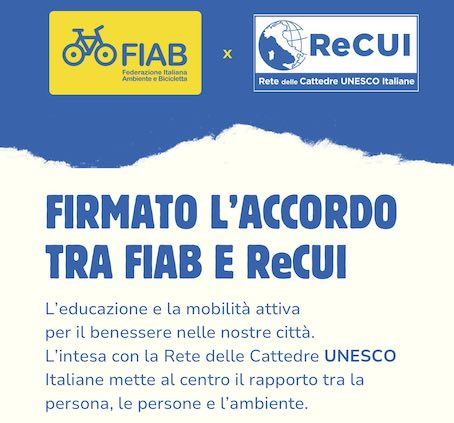 L’educazione e la mobilità attiva sono elementi fondamentali per il benessere delle nostre città. È su questo principio che poggia l’accordo quadro siglato tra FIAB-Federazione Italiana Ambiente e Bicicletta e ReCUI-Rete delle Cattedre UNESCO Italiane per lo sviluppo di progetti condivisi a favore dei territori e delle persone che li abitano, finalizzati al recupero della dimensione umana dello spazio […]