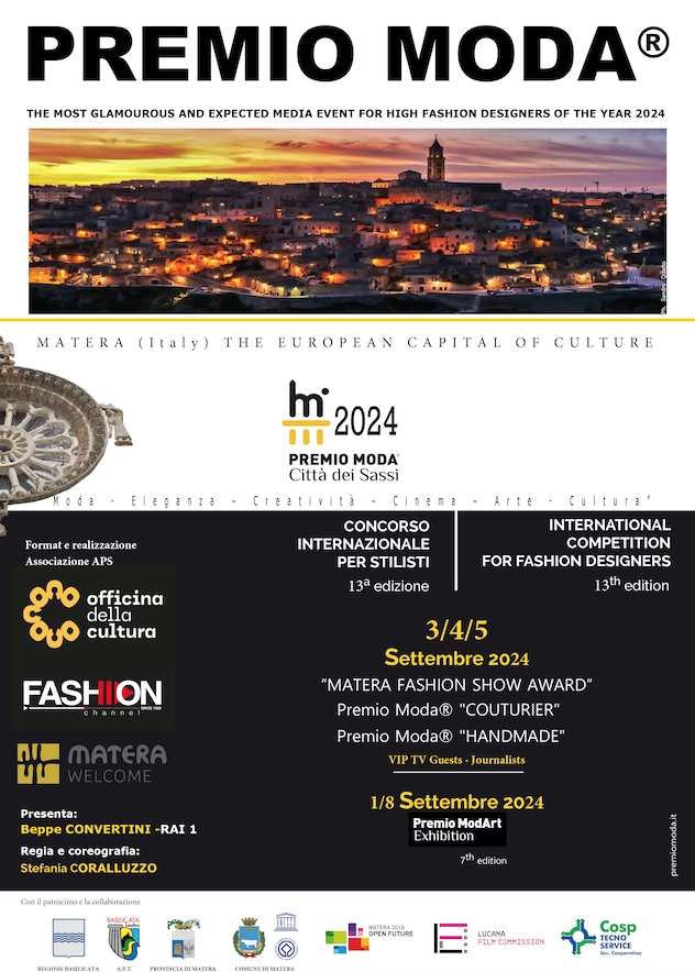 Il 3/4/5 settembre 2024 è in programma a Matera il Premio Moda® “Città dei Sassi”, concorso internazionale per stilisti giunto alla 13^ edizione e che anche quest’anno celebra l’evento attraverso il tema “moda, eleganza e creatività”. Il premio è una competizione di stilisti di alta moda e prèt à porter istituito per promuovere artigiani/creativi della moda in total look […]