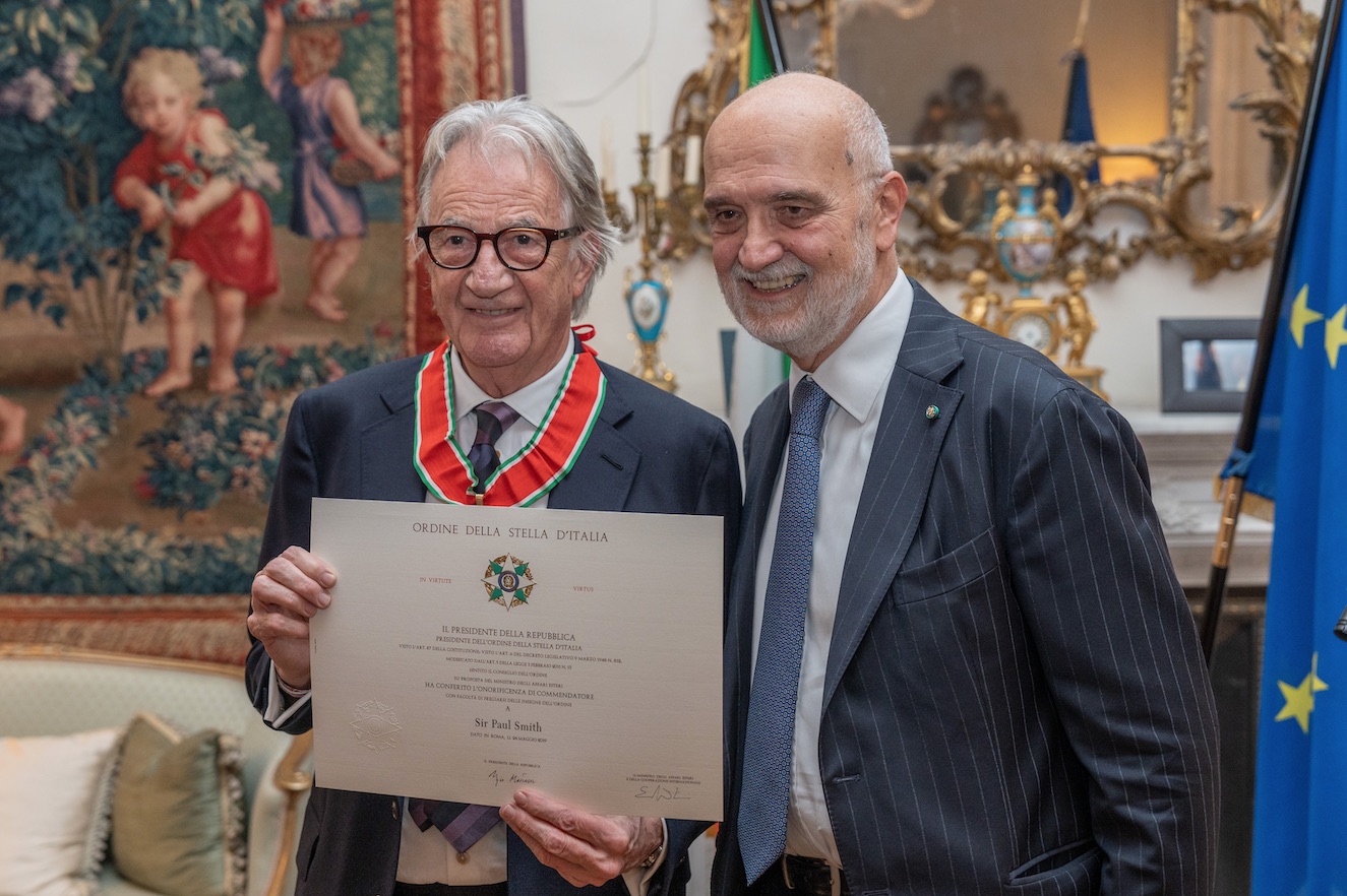 Sir Paul Smith ha ricevuto il Cavalierato dell’Ordine della Stella d’Italia in una cerimonia svoltasi nella residenza dell’ambasciatore d’Italia a Londra il 31 ottobre 2023. L’alta onoreficenza gli è stata conferita per il forte legame con l’Italia ed il constante impegno nel promuoverla nel mondo della moda.