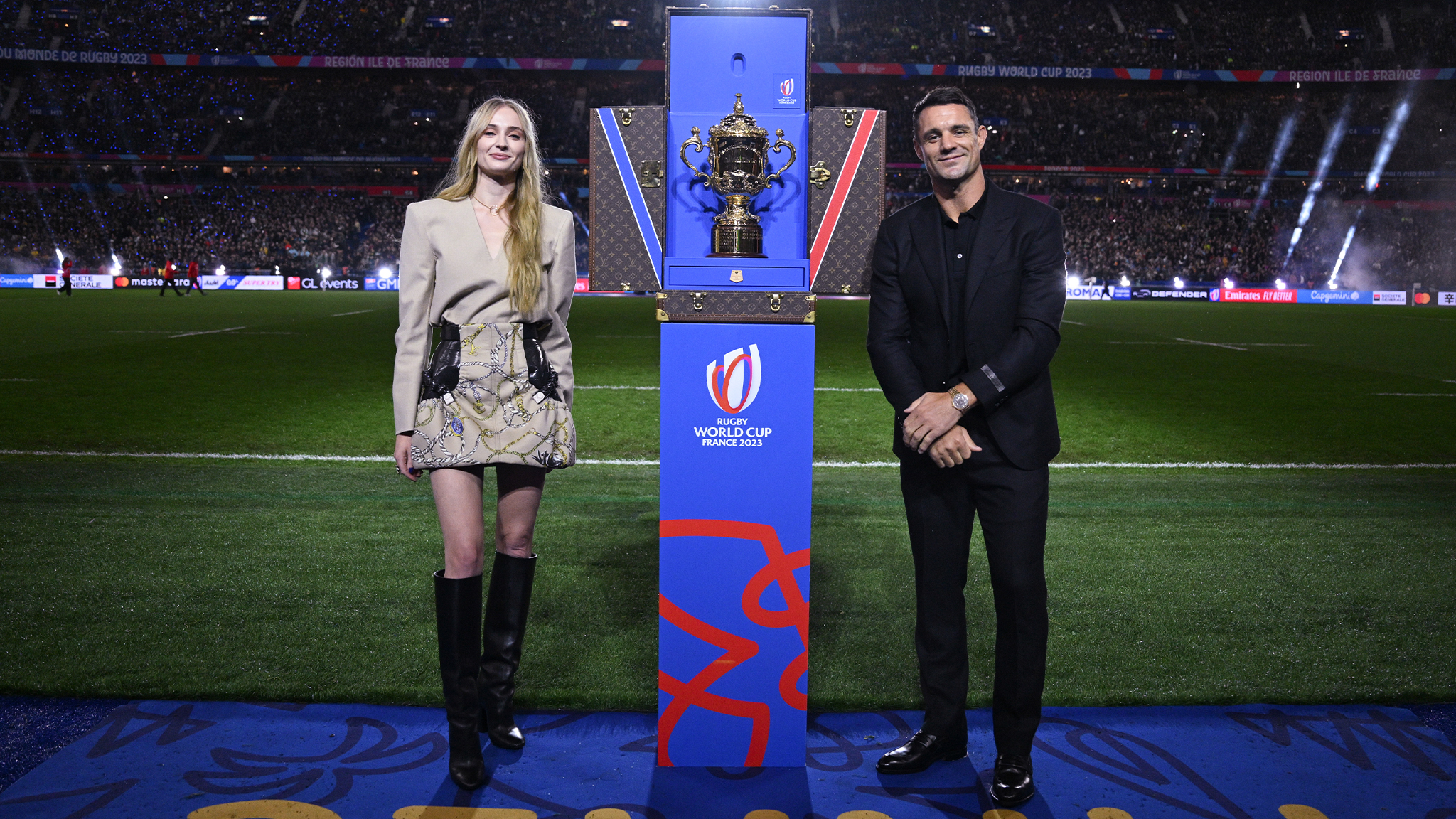 Dan Carter e Sophie Turner hanno presentato la Webb Ellis Cup nel baule porta trofeo firmato Louis Vuitton durante la finale della Coppa del Mondo di Rugby Francia 2023. Questa creazione, realizzata a mano dagli artigiani Louis Vuitton negli atelier di Asnières, protegge e trasporta la Webb Ellis Cup per tutta la durata della competizione internazionale.