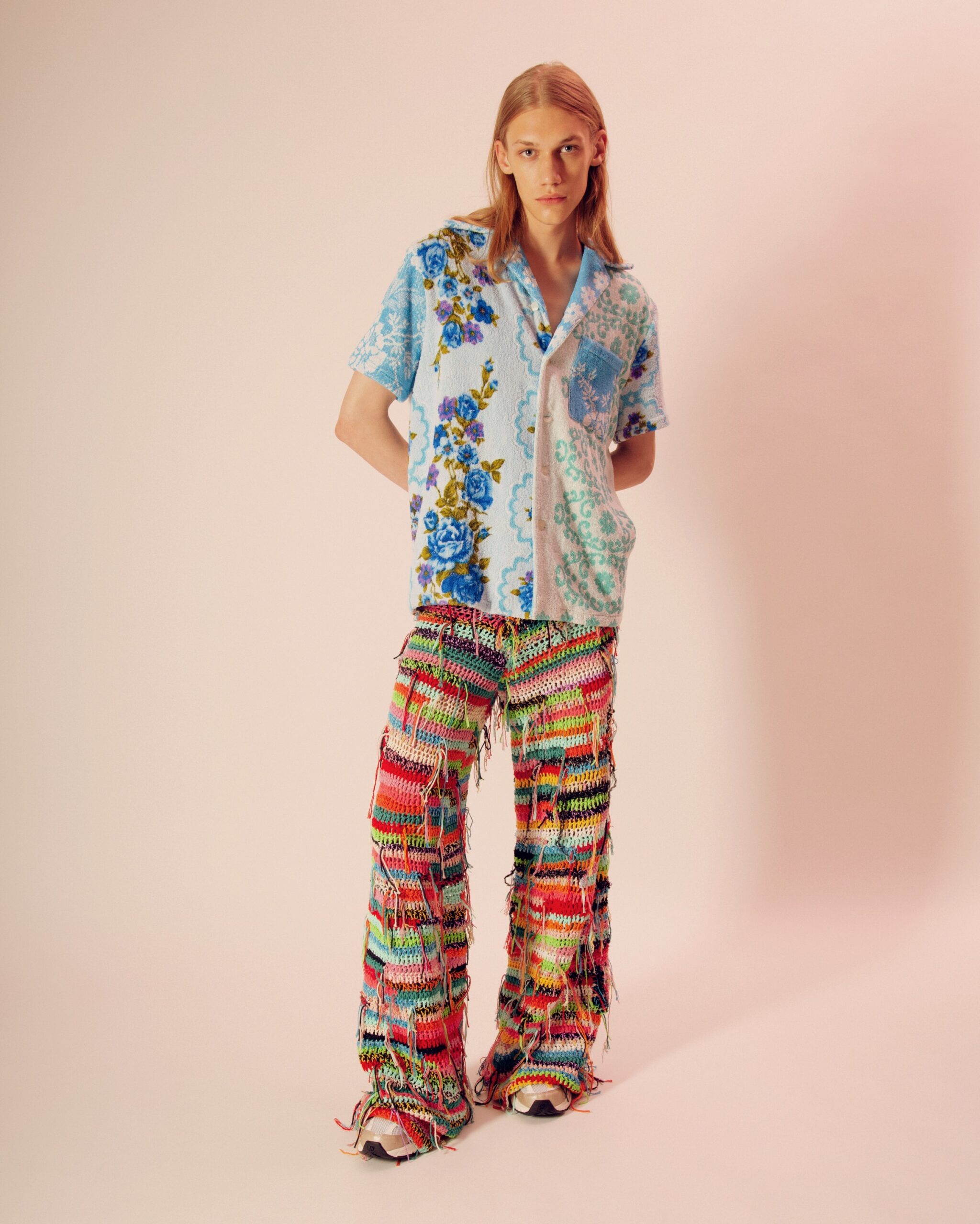Questo materiale viene riutilizzato in modo innovativo, dando una nuova vita e un nuovo scopo. Le tonalità nei colori pastello con fantasie anni ‘70 si mescolano armoniosamente in ogni creazione, creando un’atmosfera retrò ma moderna. La spugna deriva da stock di asciugamani vintage. Questi ultimi vengono tagliati e ricuciti insieme in un intricato patchwork, creando texture interessanti e dettagli elaborati.