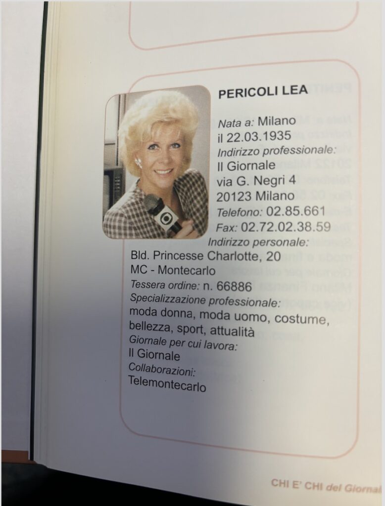 Chiudo con un ricordo, quello di Lea Pericoli che oltre ad essere stata una leggenda del tennis italiano, è stata un’icona di stile, famosa per i suoi abiti sartoriali. Una delle sue collaborazioni più iconiche è stata con il designer Teddy Tinling, il sarto più famoso del tennis, che creò abiti con pizzo, piume indossati da Lea durante tornei prestigiosi come Wimbledon. La tennista ha collaborato anche con Il Giornale dove ha raccontato il tennis e il mondo dello sport con la stessa eleganza che la contraddistinguevano sui campi da gioco. Così sono andata a prendere il primo numero del CHI E’ CHI, datato 1998 e mi sono ricordata che avevamo anche la sua scheda perchè allora scriveva anche di costume. La memoria della carta stampata…un luogo dove le storie e le persone possono essere fissate nel tempo e che definiscono la nostra storia.