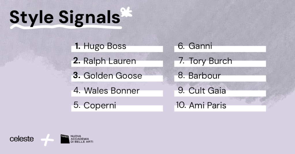 In cima alla classifica si posizionano Hugo Boss, Ralph Lauren e Golden Goose, seguiti da una nuova generazione creativa rappresentata da Wales Bonner, Coperni, Ganni e Avavav.