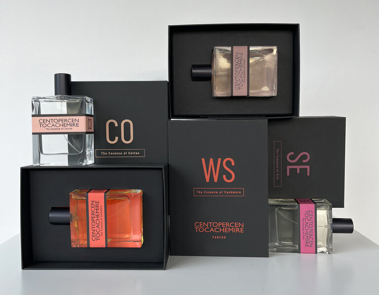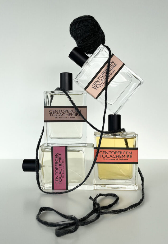 Le materie prime che da sempre definiscono l’universo di CENTOPERCENTOCACHEMIRE – cachemire, seta, lino e cotone – ispirano questa collezione olfattiva, traducendo le sensazioni tattili dei filati pregiati in esperienze sensoriali uniche.