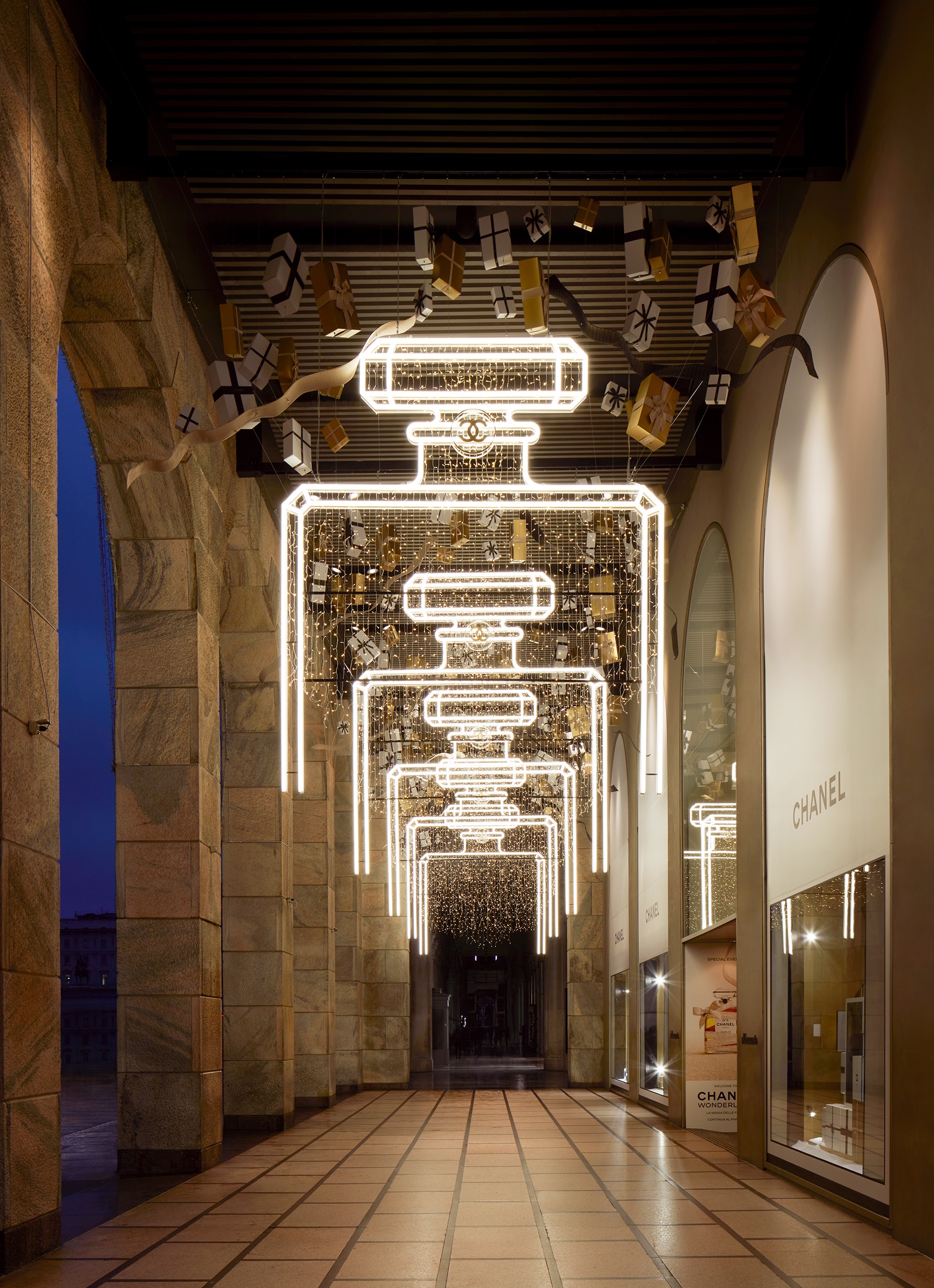 La volta della galleria e le vetrine saranno adornate con decorazioni che rievocano la tradizione festiva, reinterpretate secondo l’iconico stile della Maison. Una cascata di raffinati pacchetti regalo negli emblematici colori bianchi e oro verrà a decorare la galleria sotto la quale installazioni luminose riprendono il profilo dell’iconico flacone del N°5.