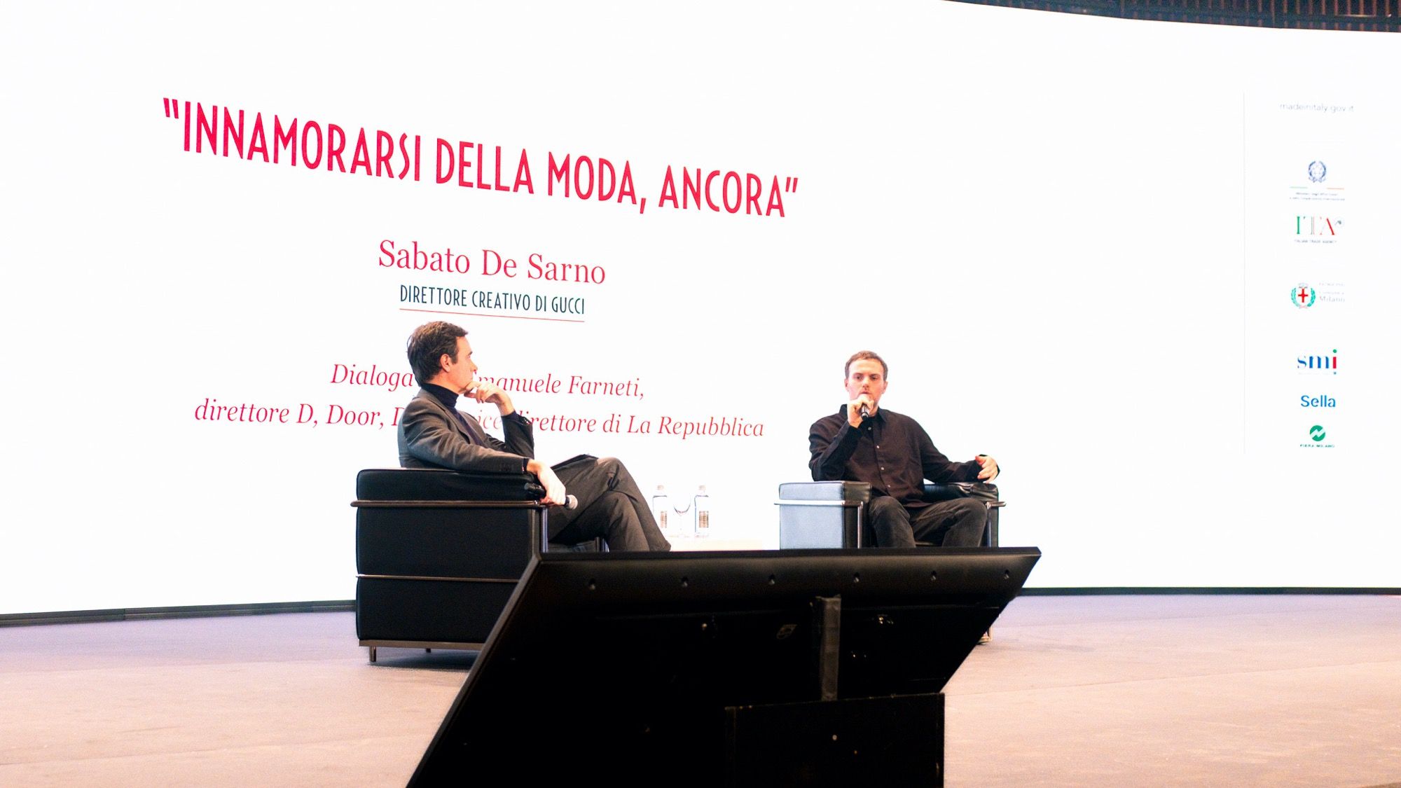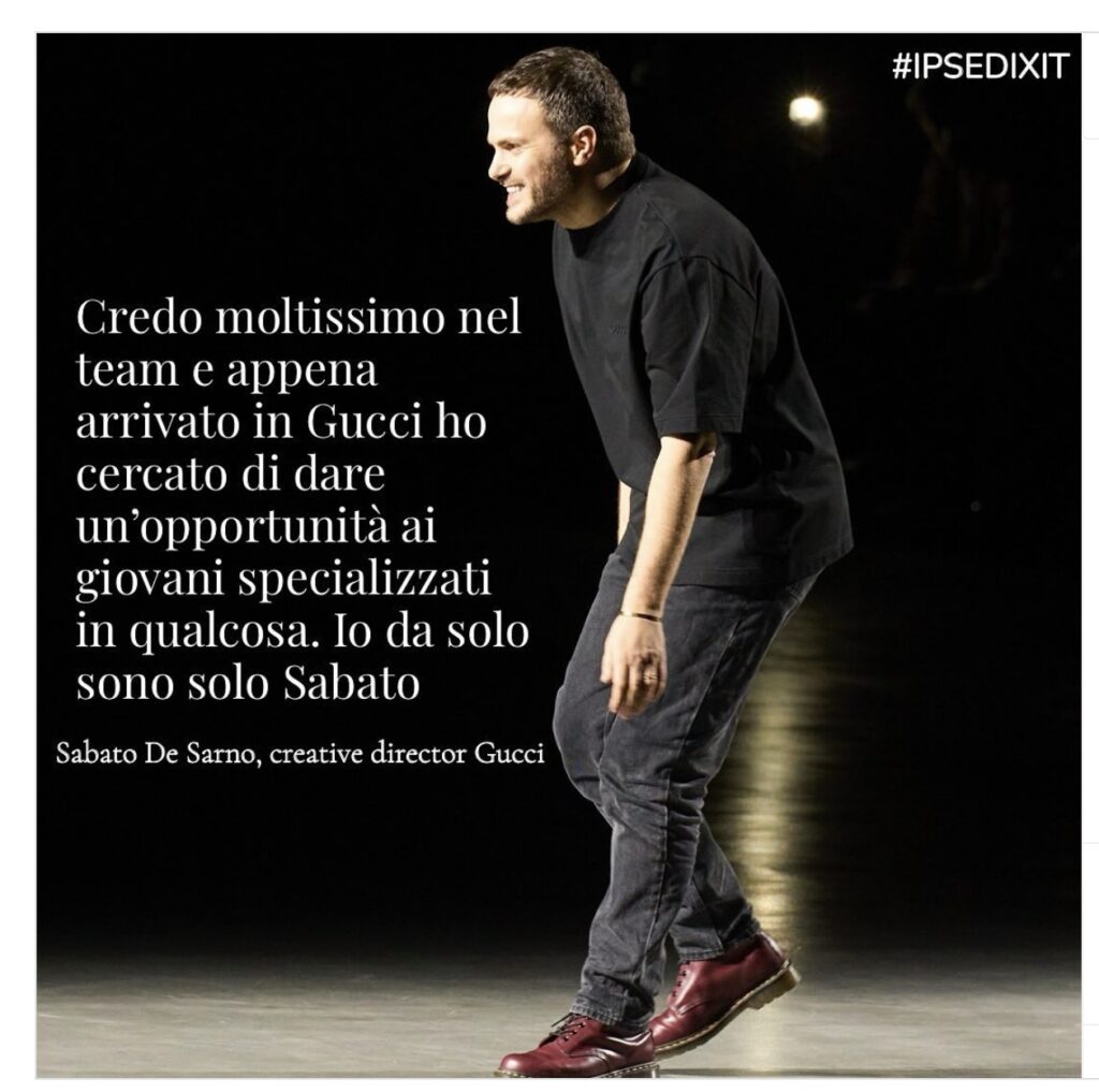 Due belle facce maschili sono quelle di Emanuele Farneti direttore D, Door, DLui e vice direttore di La Repubblica e Sabato De Sarno, Direttore Creativo di Gucci che si sono incontrati a Milano Unica ed hanno dialogato davanti ad una platea di giovani studenti. “Senza un team sono solo Sabato, voglio lasciarmi trasportare da quello che sento e dalla mia empatia per le persone” ha detto con umiltà il designer, conquistando l’applauso dei ragazzi che sognano di lavorare nella moda e che hanno sempre più bisogno di sentire raccontare dal vivo le esperienze lavorative e i sacrifici che portano al successo.