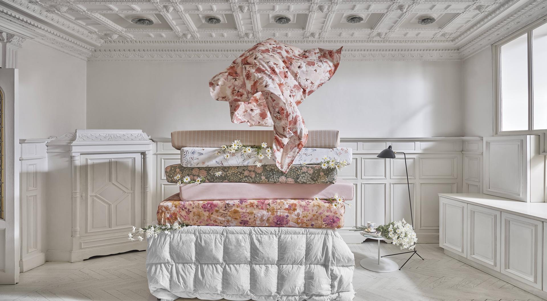 PARURE LENZUOLO CON FANTASIA A FIORI Un set in delicato cotone arricchito da piccoli dettagli floreali regala un tocco di primavera al letto.