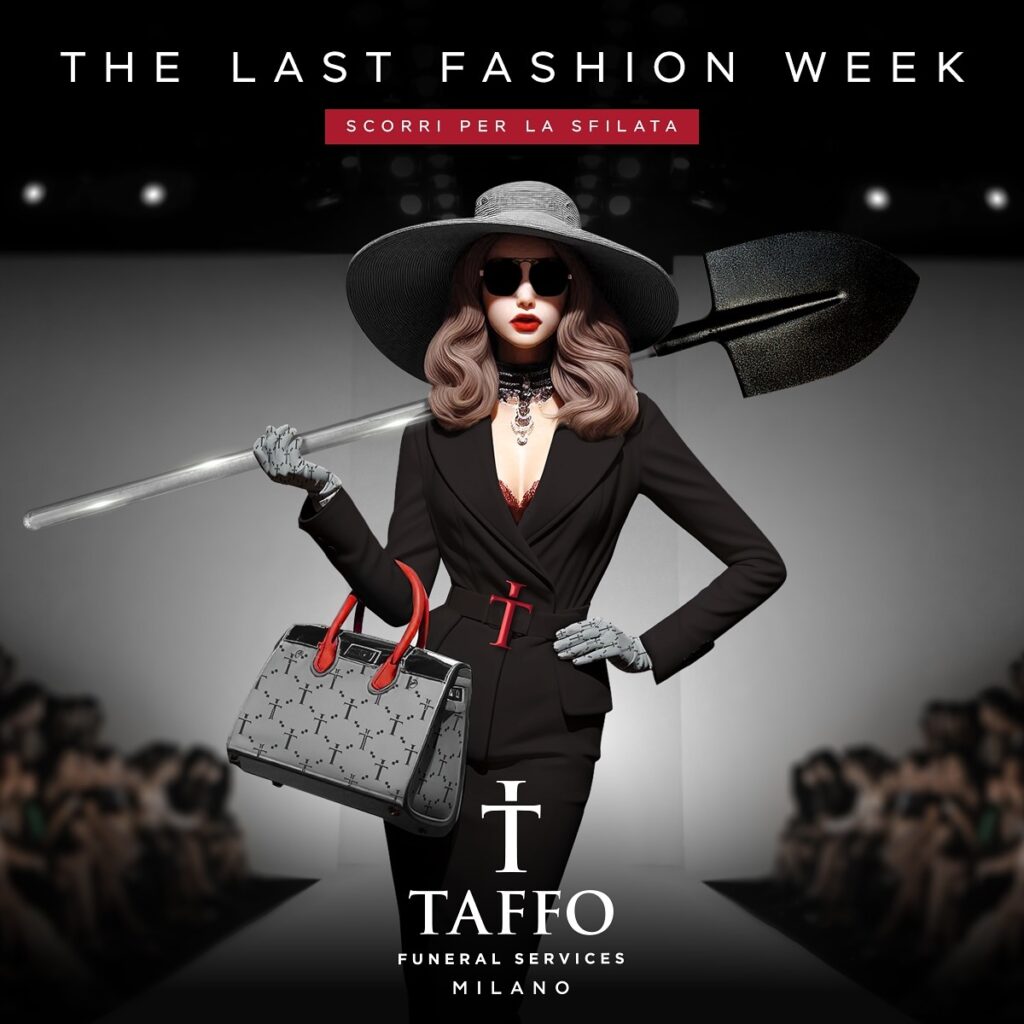 Insomma tutto questo per dirvi che a volte bisogna rompere per ricostruire, perchè lo slogan “L’ultima sfilata te la facciamo fare noi” della ditta funebre Taffo non sia solo una macabra campagna pubblicitaria creata dall’AI, ma un modo per seppellire i cliché di un mondo che non può più permettersi di sperperare capitali in prodotti che servono solo ad alimentare l’ego dei proprietari. E soprattutto che la moda non sia solo una vetrina per pagliacci, mogli di narcotrafficanti o sedicenti creativi o inquietanti personaggi in cerca di visibilità.