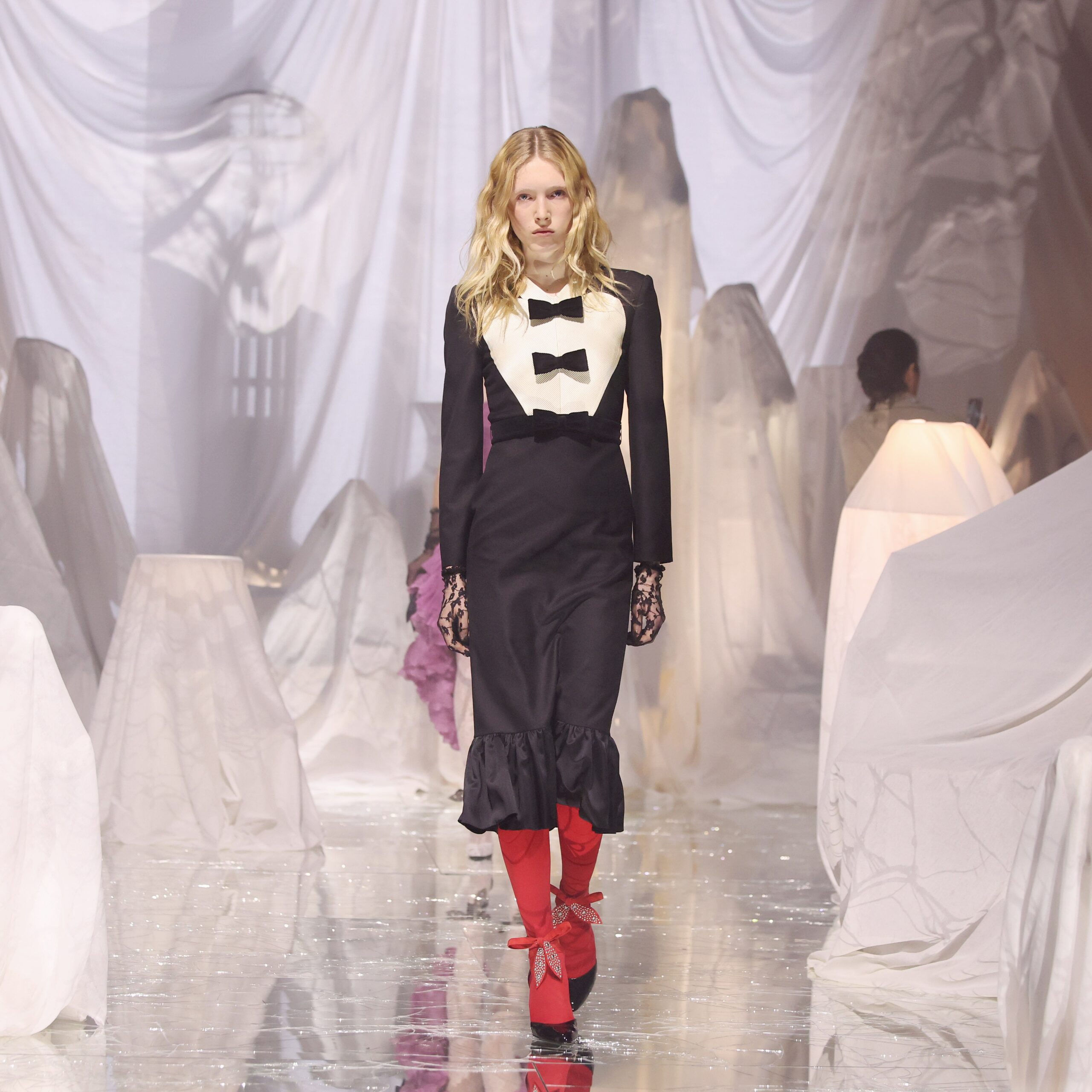 Ecco perchè vedere le sfilate a Parigi è grande motivo di riflessione e stimolo anche per chi deve trovare le giuste parole per descriverle. Il debutto della Valentino by Alessandro Michele è quindi stato il giusto COUP DE THÉÂTRE in un contesto globale che di sorprendente ha dato ben poco, per questo tanto atteso da tutti. Una sfilata che va oltre alle chiacchiere ed ai frettolosi giudizi, ma che va ammirata per la capacità di aver creato qualcosa di grande impatto. Un colpo che in 120 uscite ha tenuto incollati per 30 minuti tutti gli appassionati di moda, con immagini di squisita bellezza e di potenza, perchè solo chi riesce a rendere un abito eccitante nel suo essere, accende il desiderio di possederlo. Ed Alessandro Michele è bravo a gestire la suspence e la teatralità delle sue sfilate perchè l’arte e il cinema sono la sua passione, lui non ha creato una nuova Valentino, ma ha fatto il suo Valentino, rompendo con il passato ( la passerella di specchi rotta con tanto di effetto asmr alla sfilata ) senza però annullarlo, tanto che ogni look ha un riferimento chiaro alla storia del brand, con una ricerca minuziosa del suo archivio.