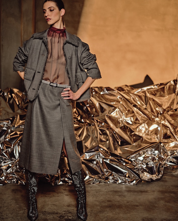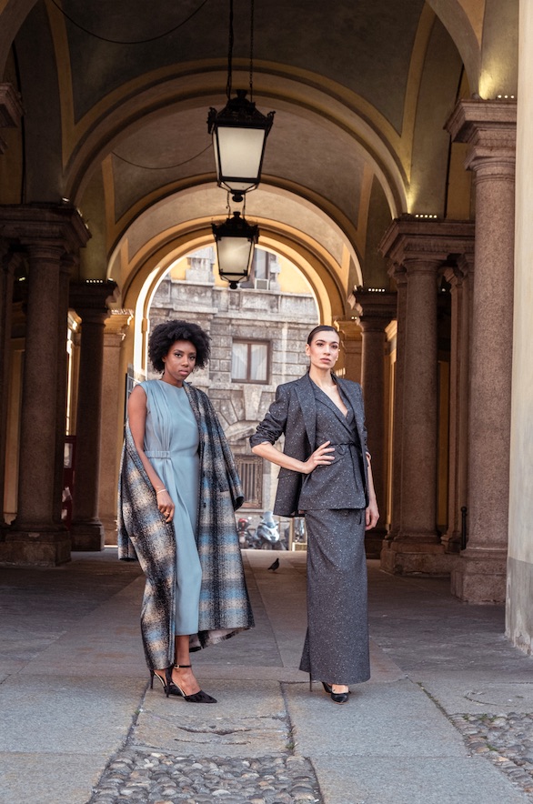 Il focus come sempre è sugli abiti che, ispirati dai nomi delle città venete, acquistano splendore e importanza: il Venezia dress è nero, in seta con una profonda scollatura bordata di velluto. Così come il Dogaressa, uno slip dress sontuoso in satin nero, con una costruzione grafica della scollatura di grande effetto. Nera è anche la maxi shirt di organza che si chiama Laguna, da indossare sopra un abito lungo essenziale e raffinato e nero ovviamente è l’elegantissimo tuxedo. Ma ci sono anche gradazioni di grigio negli abiti e completi da giorno in faille e crepella di lana.
