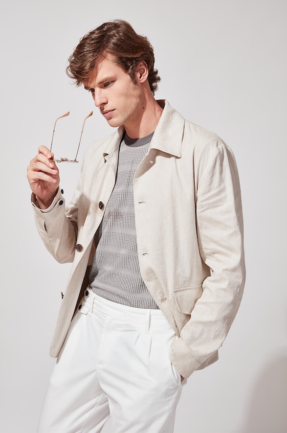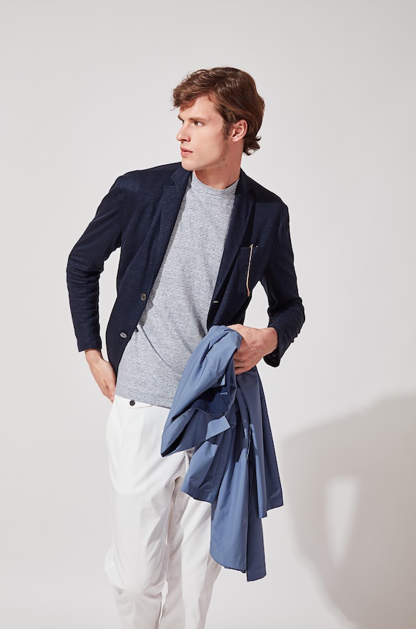 È così che il maschile singolare del brand è tutto concentrato a indagare a un concetto elegantemente sportivo, capace di flirtare con il bon ton e, al contempo, di graffiare con uno sportswear colto i classici del guardaroba daily chic, maglie e pantaloni su tutti. Una proposta, disegnata sul colore-sofisticato e puro, perfetto per il quotidiano –, su linee essenziali, su forme sussurrate, la cui idea d’insieme rimanda a una visione rispettosa dell’ambiente, nuovo cardine della filosofia del brand. Dal punto di vista creativo, Cruciani persegue nella creazione di total look in cui protagonisti sono leggeri impermeabili accompagnati da giacche destrutturate in seta e lino, da portare con pantaloni di lino e di cotone e con polo dall’eleganza décontracté in seta e cashmere.