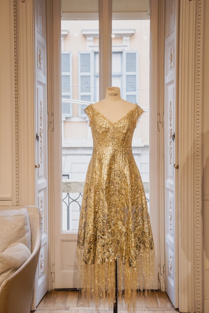 Gli abiti della collezione riprendono i colori di un tramonto di inizio estate, con dettagli luminosi che evocano il riflesso delle stelle sulla superficie di un lago al crepuscolo.
